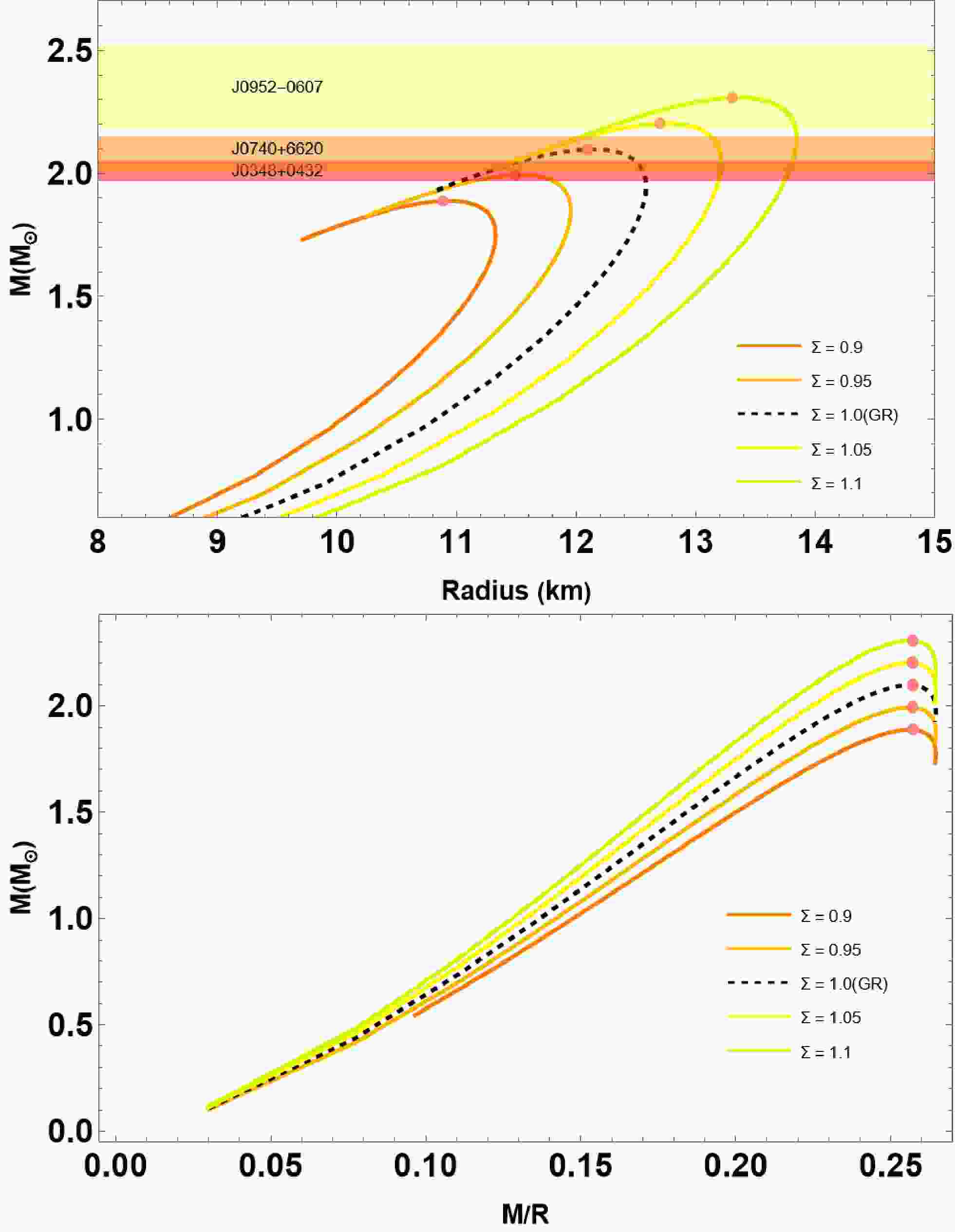 $ (M-R) $ and mass-compactness$ (M-M/R) $ relations, as shown in Fig. 1, for different Σ values. For this investigation, we selected$ B_{{\rm{eff}}}= B_{{\rm{eff}}, \perp} = $ 70 MeV/fm3, with the additional parameters set as$ \bar{\lambda} =0.2 $ and$ \bar{\lambda}_{\perp}= 0.5 $ . As evident from Fig. 1, the parameter Σ can influence the maximum gravitational mass$ M_{\rm max} $ of QSs, which reaches 2.30$ M_\odot $ with a corresponding radius$ R=13.30 $ km at$ \Sigma =1.10 $ . Furthermore, we compare our results with the predicted masses and radii of the pulsars, specifically PSR J0952-0607 with a mass$ M = 2.35 \pm 0.17\; M_{\odot} $ (yellow) [67], PSR J0740+6620 with a mass$ M = 2.08 \pm 0.07 $ $ M_{\odot} $ (orange) [68], and PSR J0348+0432 with a mass$ M = 2.01 \pm 0.04\; M_{\odot} $ (pink) [69]. For completeness, we also compute the$ (M-R) $ relation for the GR solution, i.e., when$ \Sigma =1.0 $ . Based on the results presented in Table 1, it is observed that the maximum mass may exceed its GR counterpart when$ \Sigma > 1 $ . Finally, the bottom panel of Fig. 1 illustrates how Σ influences the characteristics of maximum compactness. The findings indicate that the maximum compactness is invariant to the value of Σ, maintaining a constant ratio of$ \dfrac{M}{R} \sim 0.257 $ , as listed in Table 1. Moreover, our findings indicate that the Buchdahl limit is maintained, such that$ M/R < 4/9 $ .
