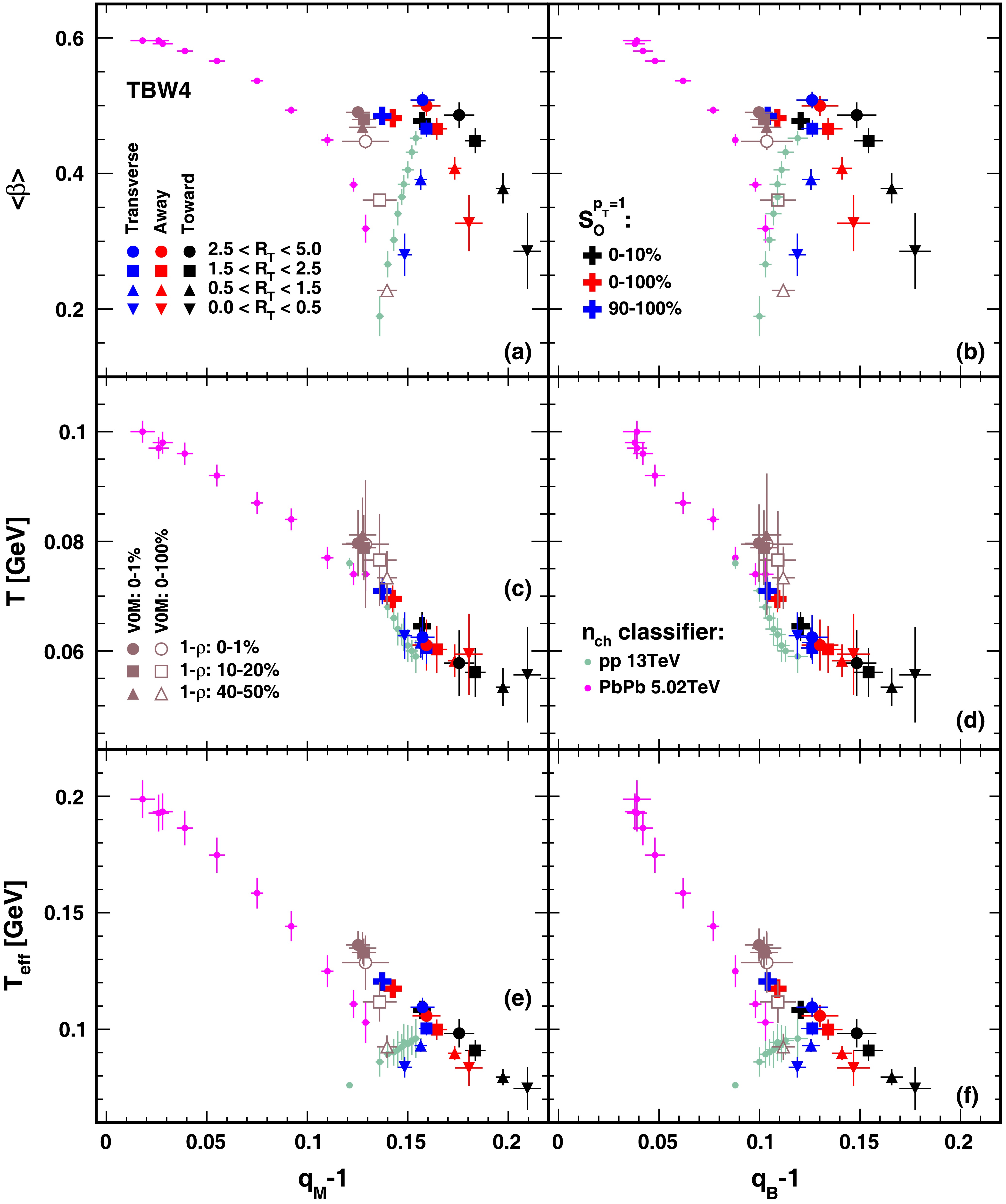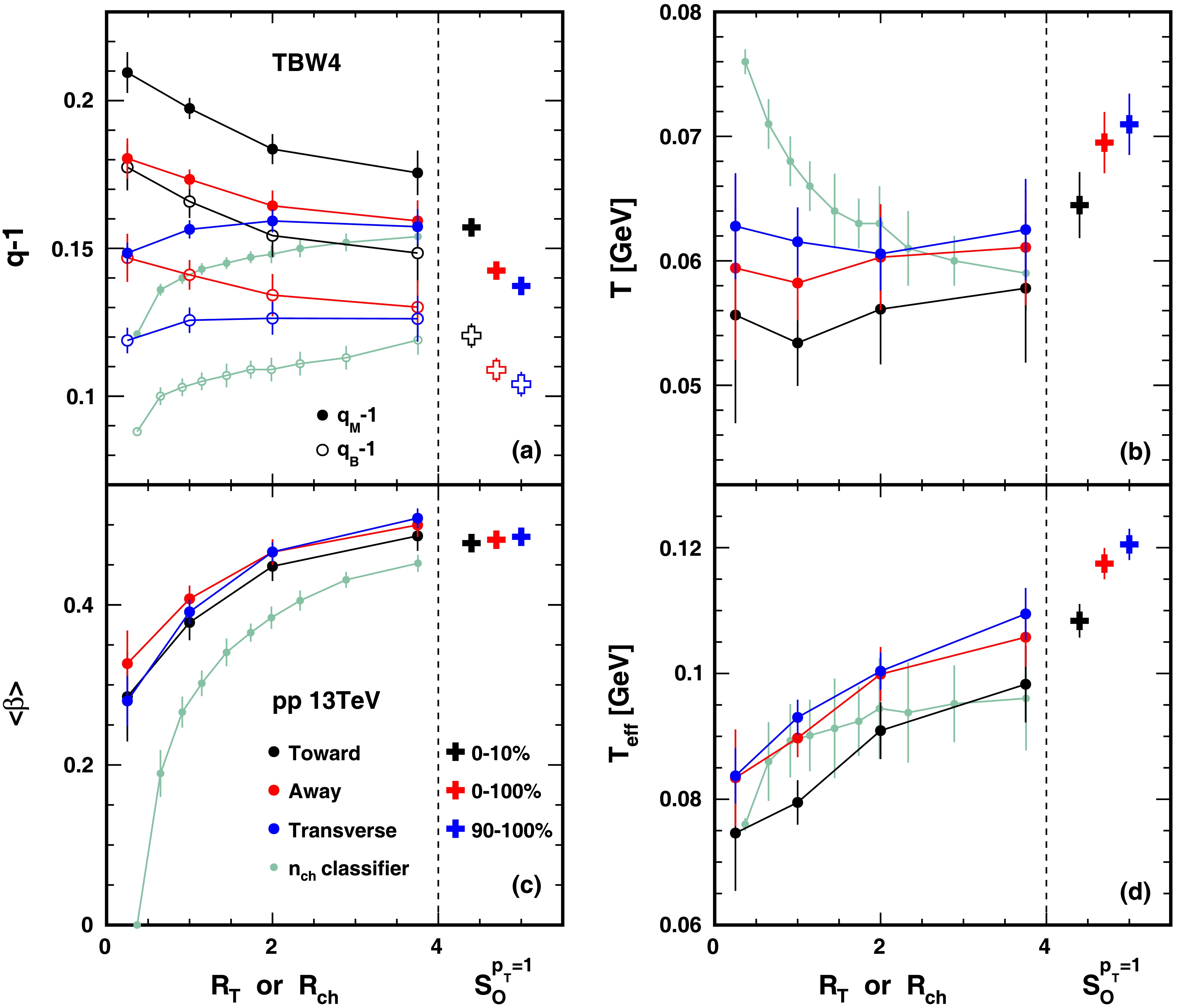 $R_T$ ,$R_{ch}$ , and$S_O^{{p_T}=1}$ dependencies of extracted freeze-out parameters and effective temperature$T_{\rm eff}$ in pp collisions at$\sqrt{s}$ = 13 TeV from TBW4 fits. The black, red and blue circle markers correspond to toward, away, and transverse regions. The green circle markers [29] correspond to the$n_{ch}$ classifier. The cross markers correspond to different sphericity. In panel (a), open markers represent the results of$q_B-1$ , and solid markers represent the results of$q_M-1$ .The non-extensive parameter values are presented in Fig. 8(a), with solid and open markers representing