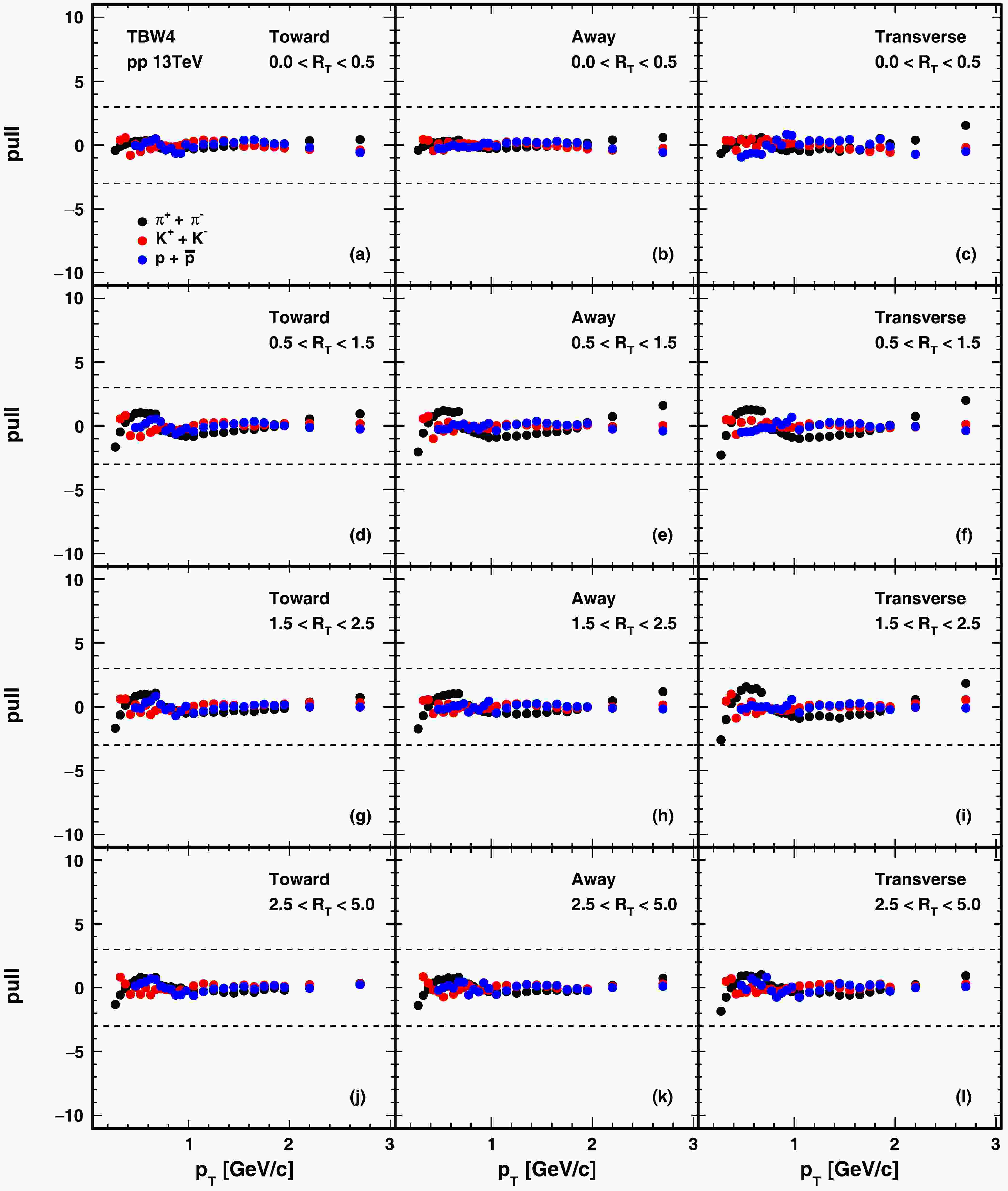$\sqrt{s}$ = 13 TeV. Black, red, and blue correspond to$\pi$ , K, and p particles, respectively. From top to bottom, the rows represent$R_T$ intervals of 0−0.5, 0.5−1.5, 1.5−2.5, and 2.5−5. From left to right, the columns represent the forward, backward, and transverse regions. The dashed lines represent where the difference between the model and experiment data is three times the error of data.We perform the same TBW analysis with an independent baryon non-extensive parameter on the