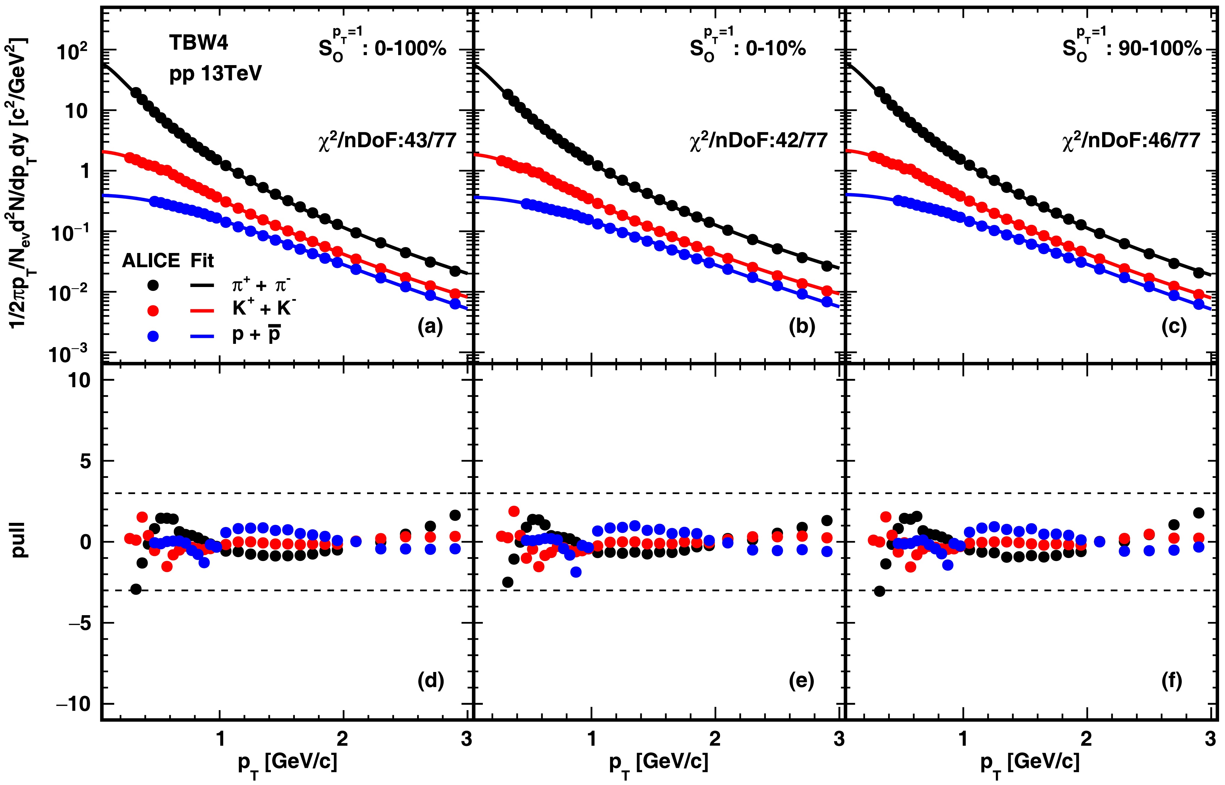 $\sqrt{s}$ = 13 TeV. Black, red, and blue correspond to$\pi$ , K, and p particles, respectively. The points represent the ALICE experimental data [26], and the lines represent the fit results. From left to right, the columns represent sphericity intervals of 0−100%, 0−10%, and 90%−100%. The top row shows the$p_T$ spectra, and the uncertainties in the experimental data are the quadratic sum of statistical and systematic errors. The bottom shows deviations from the$p_T$ fit, and the dashed lines indicate where the difference between the model and experimental data is three times the uncertainty of the data.$ S_{O}^{p_{T}=1} $