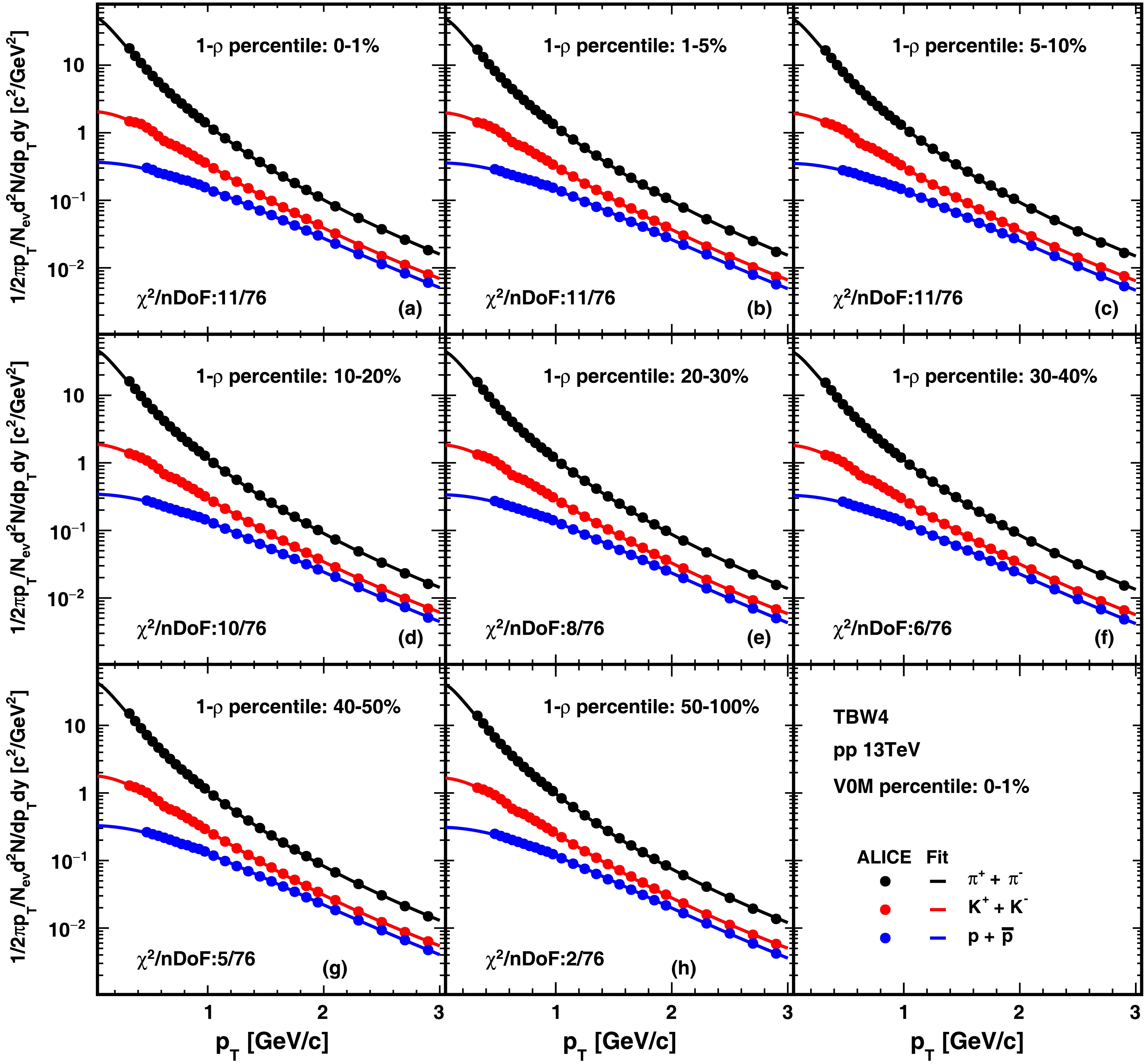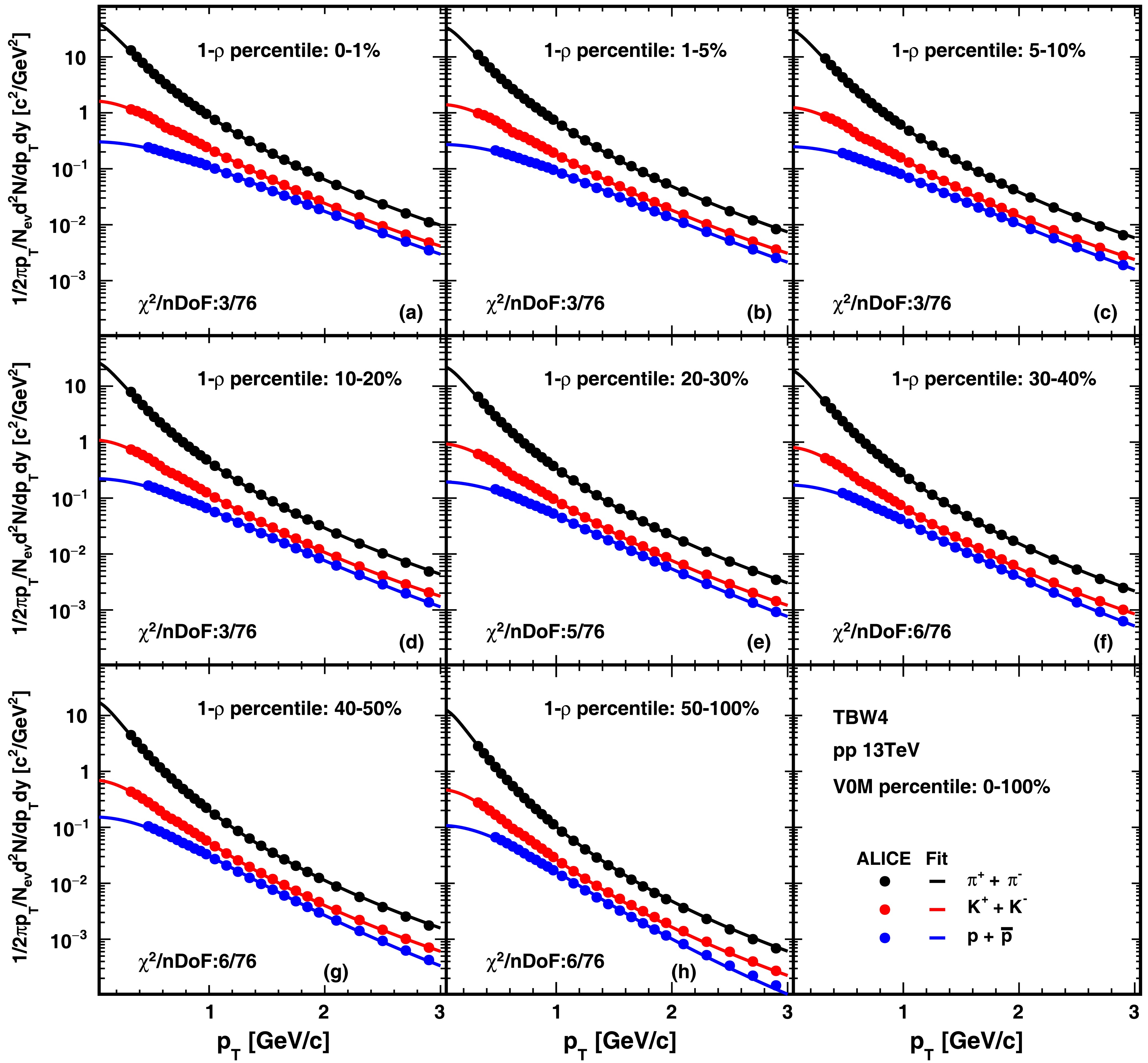 Figure 6. (color online) TBW4 fits to hadron spectra in pp collisions at