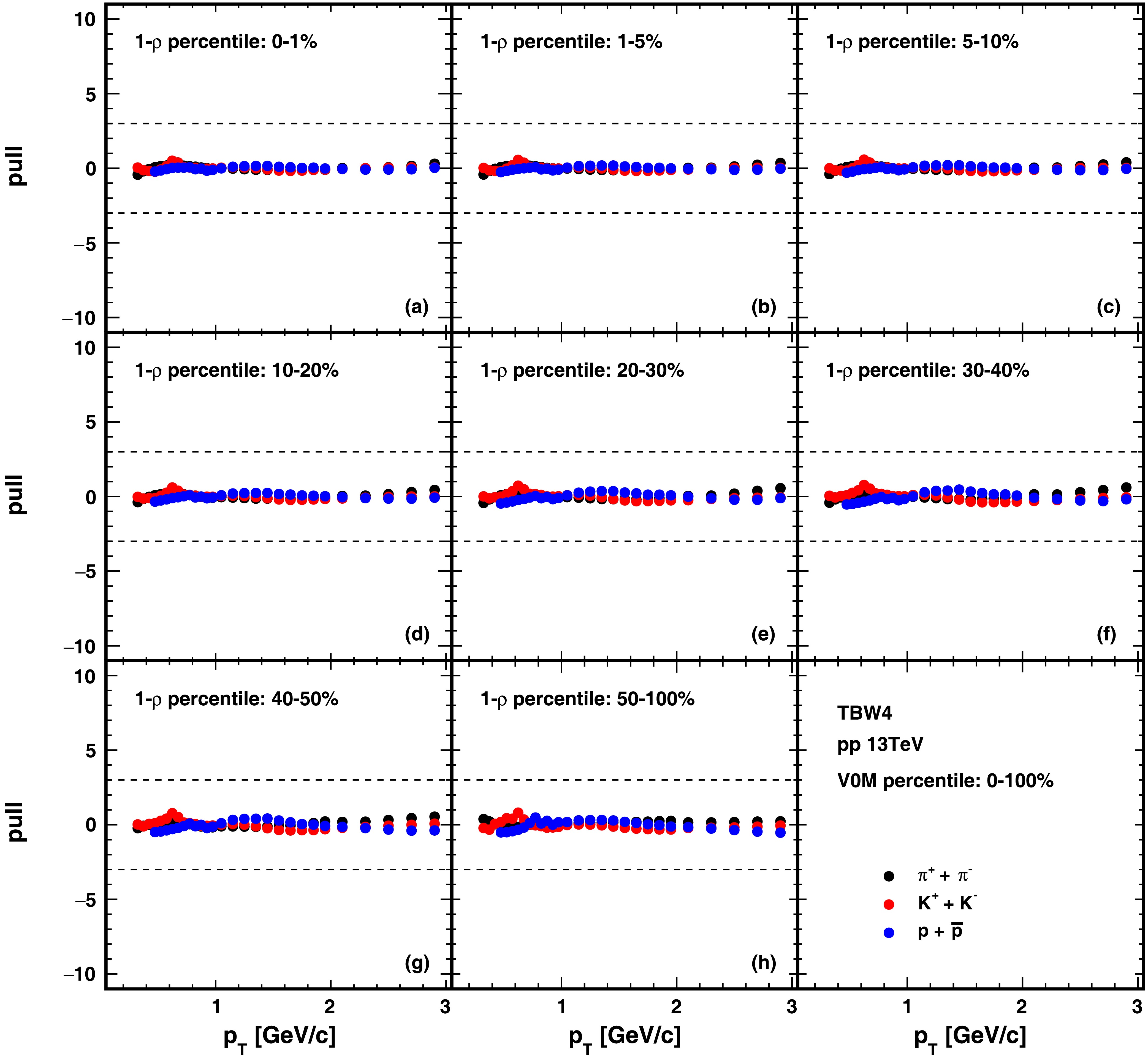 $\sqrt{s}$ = 13 TeV. Black, red, and blue correspond to$\pi$ , K, and p particles respectively. From panel (a) to (h), the results of different flattenicity event classes for high-multiplicity events (V0M percentile 0–1%) are presented. The dashed lines represent where the difference between the model and experiment data is three times the error of data.V0M $ 1-\rho $