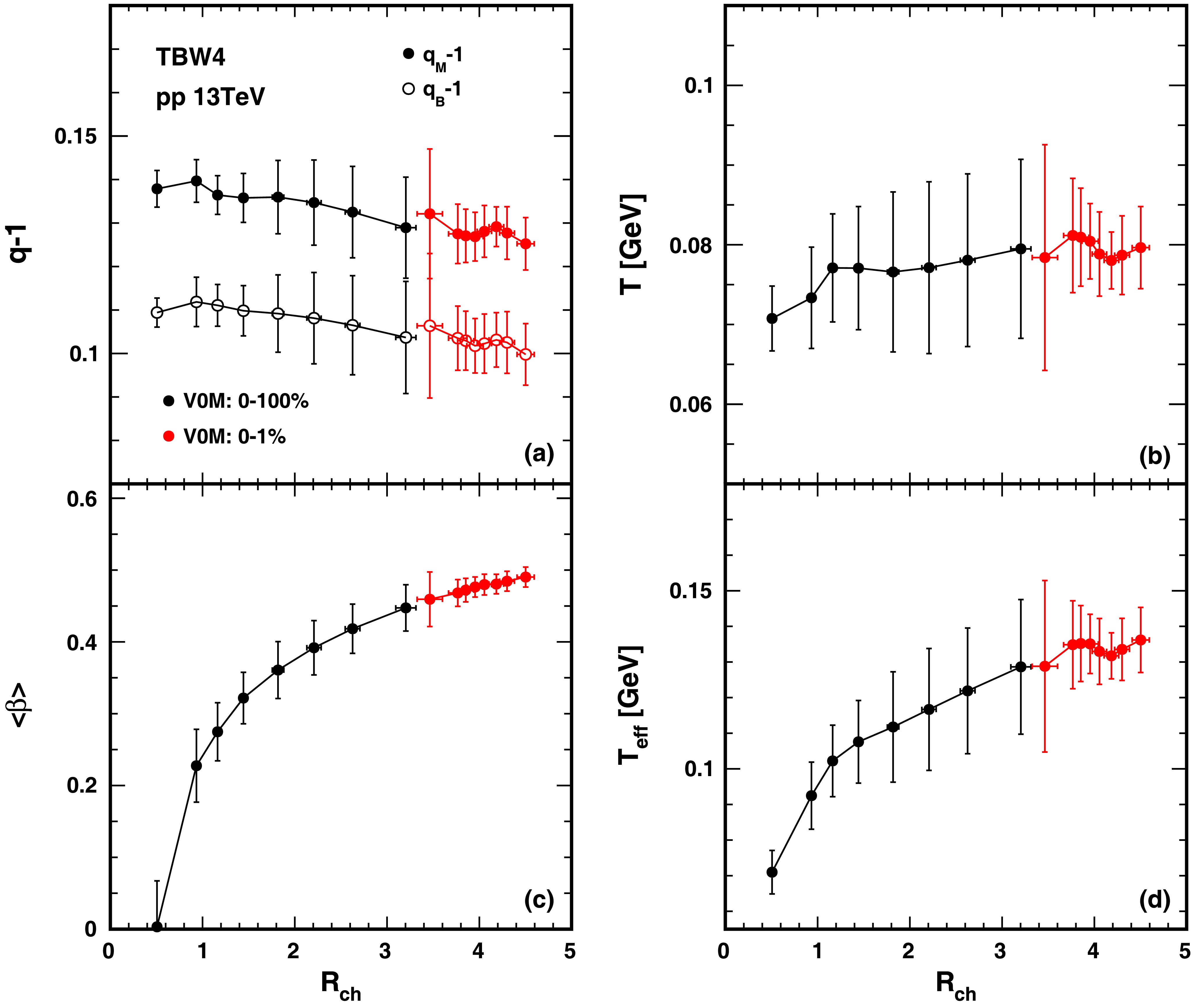 $R_T$ dependence of the extracted freeze-out parameters and the effective temperature$T_{eff}$ in pp collisions at$\sqrt{s}$ = 13 TeV from TBW4 fits. Black and red represent flattenicity in multiplicity-integrated and high-multiplicity event classes. The direction of increasing$R_T$ is consistent with the direction of increasing flattenicity (from 50-100% to 0-1%). In panel (a), open markers represent the results of$q_B-1$ and solid markers represent the results of$q_M-1$ .Determining the onset of collectivity in small systems is crucial for understanding if they can achieve the critical energy density necessary for QGP formation. This type of investigation is usually carried out using global multiplicity to estimate the energy density of the system. A prominent approach to this search, exemplified by the work of Ref. [43, 44], employed Tsallis and Hagedorn functions to fit the hadron spectrum in pp collisions, identifying an inflection point in the transverse flow velocity as a possible phase transition signal. Their analysis suggests a smooth evolution toward thermalization at high event activity similar to our findings in this work. It is interesting to note that the current work by incorporating event shape observables offers a more differential probe of the medium’s properties than multiplicity alone. We argue that the emergence of collective effects is not solely dependent on the global energy density probed by multiplicity, but also on its spatial distribution within the collision volume. Event shape classifiers enable comparisons between events with similar multiplicities but vastly different internal geometries, providing complementary dimension to works in Ref. [43, 44].