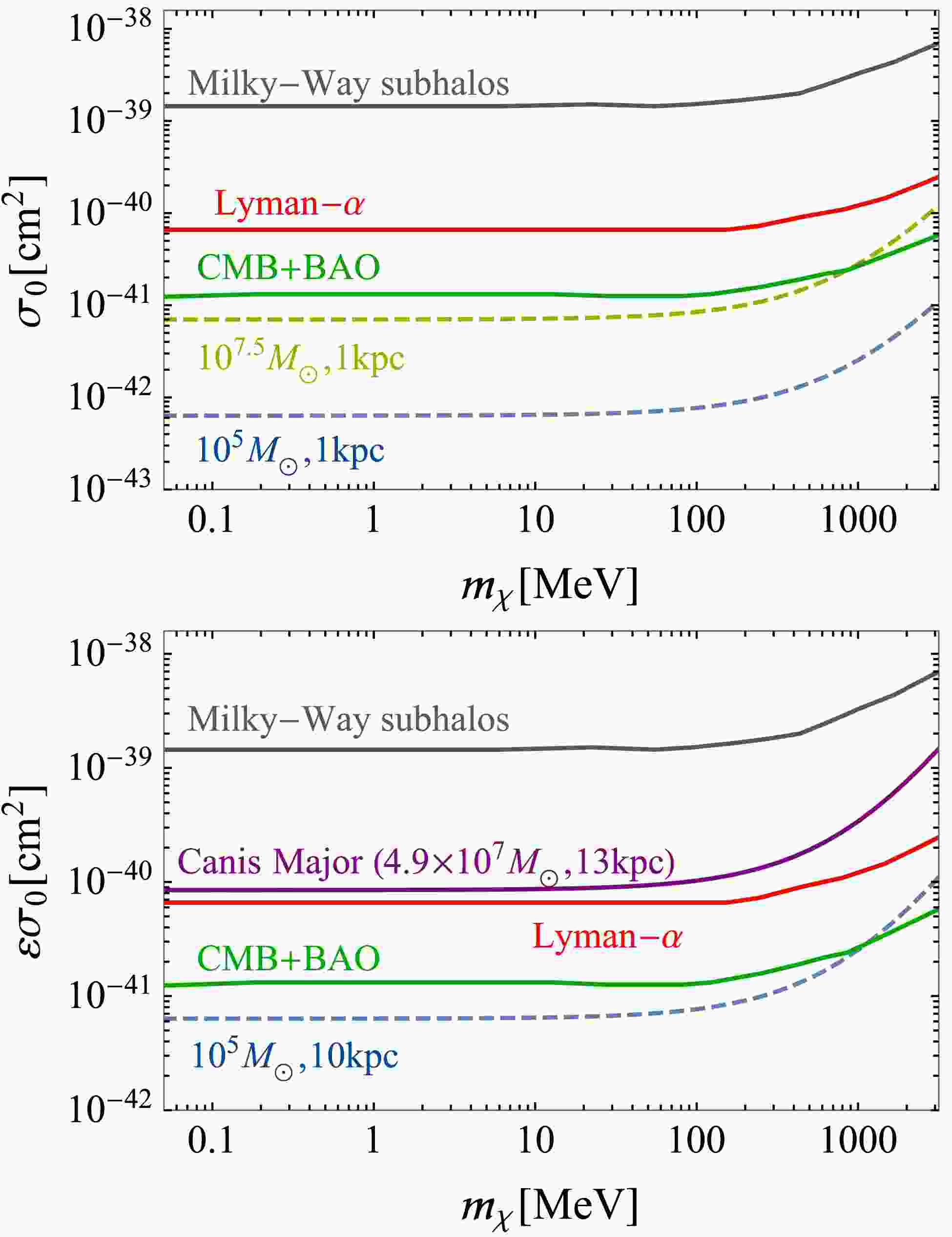 $ 10^{7.5} \;M_\odot $ subhalos, and the expected evaporation limit is shown by the yellow dashed line. This line aims to illustrate the maximal soft scattering evaporation ability. For a DM mass below 1 GeV, with existing CMB+BAO limits, soft collisions alone can evaporate away$ 10^{7.5} \;M_\odot $ subhalos at 1 kpc distance from the galactic center. In the lower figure, we show a real example, the Canis Major substructure, which is located at a distance of approximately 13 kpc from the Milky Way's center and has a mass of approximately$ 4.9\times10^{7} \;M_\odot $ [65]. The center of the Canis Major Dwarf Galaxy lies around$ (1, b) \sim\left(240^{\circ}, -8^{\circ}\right) $ (l and b are the Galactic longitude and latitude, respectively), and its orbit is almost coplanar with the galactic disk. Current observations and N-body simulations indicate that it is being disturbed by the Milky Way's gravity, but its core still remains relatively stable [66]. The corresponding evaporation limit is shown by the purple solid line. The constraints from the datasets of CMB+BAO (solid green), Lyman-α forest (solid red) and Milky-Way subhalos (solid gray), which are from a recent study, are also shown for comparison [56].Previous cosmological constraints on DM-baryon interactions can be briefly summarized as follows: the exchange of heat between DM and baryons would cool the baryons and lead to recombination occurring earlier, which can directly impact the CMB [41, 42]. Meanwhile, in the presence of DM-baryon interactions, baryon photon coupling can convey pressure to the DM, which damps the clustering of DM against structure formation and leads to a suppression on the matter power spectrum [35−37].