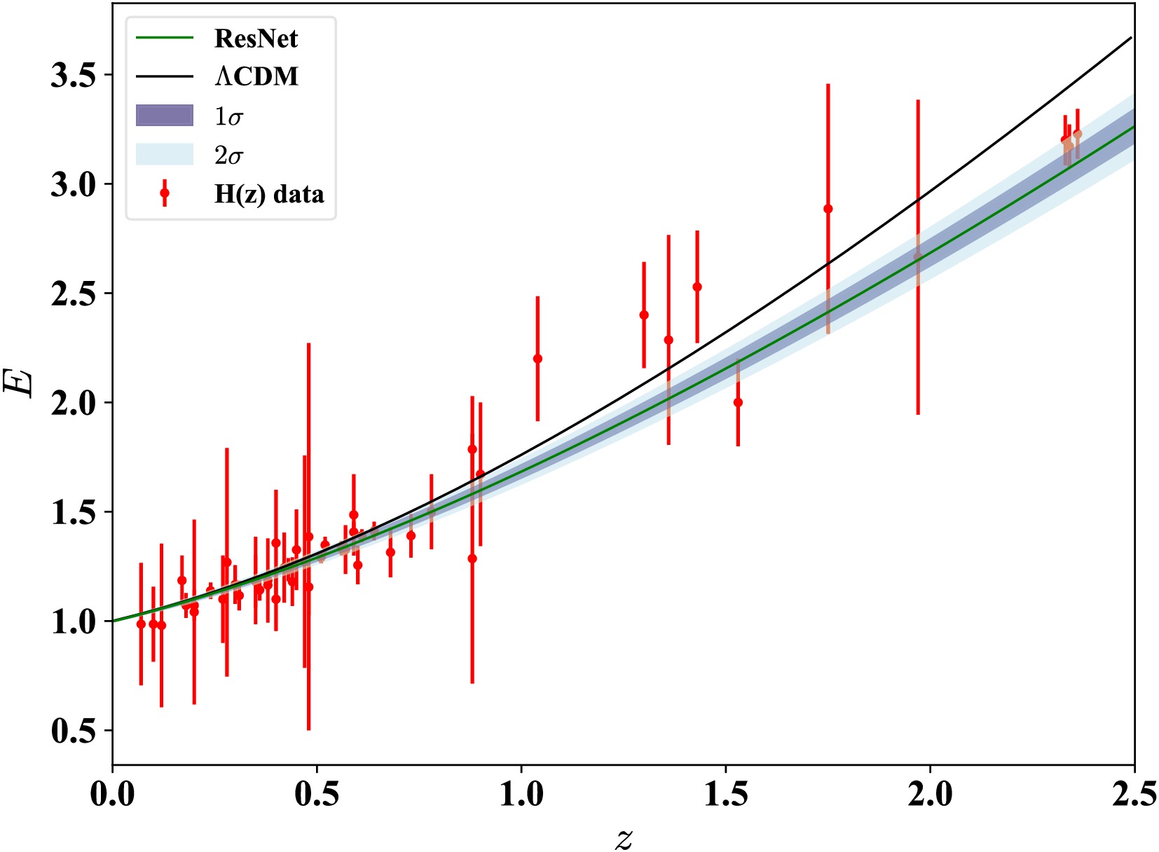 1 —to reconstruct the dimensionless Hubble parameter E(z) and the comoving distance D(z) from observational datasets, and further obtain the derivative D'(z) through numerical differentiation. Unlike conventional deep learning methods that may yield non-smooth outputs due to their discrete predictions, our ResNet architecture enables smooth function reconstruction, which is essential for reliable numerical differentiation and curvature diagnostics.Figure 2 shows the reconstruction of E(z) using H(z) measurements. The green line denotes the ResNet output, with 1