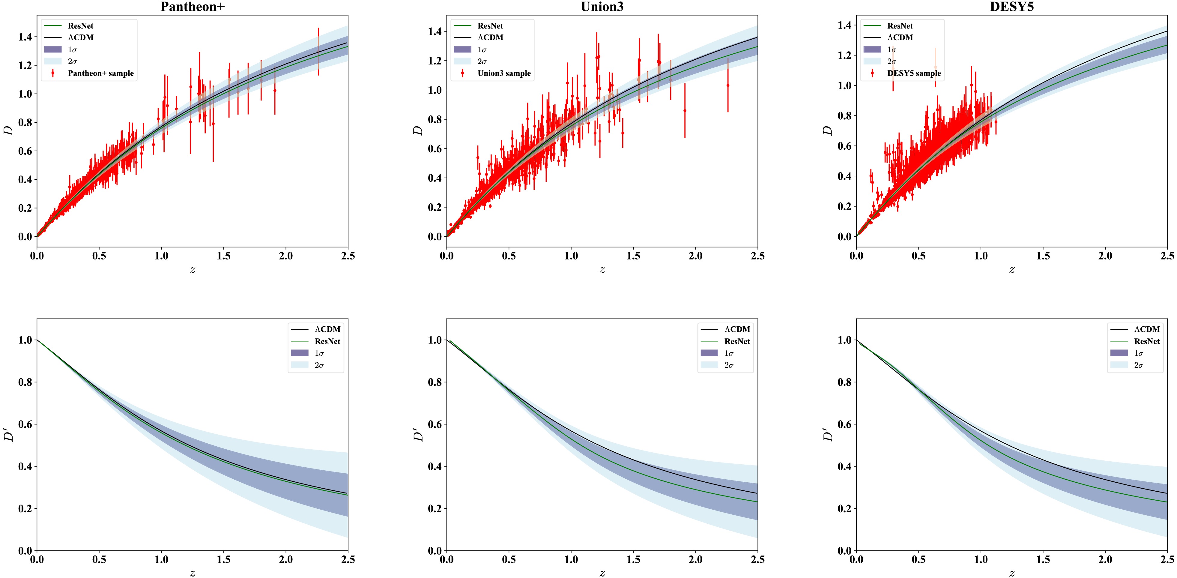 $ \sigma $ and 2$ \sigma $ credible regions shaded in dark and light blue, respectively. The H(z) data points are shown in red, while the black curve is the reference curve representing the standard$ \Lambda $ CDM model with fiducial parameters$ \{\Omega_m,H_0\} = \{0.3,\ 70\ \mathrm{km\ s^{-1}\ Mpc^{-1}} \} $ . The reconstruction aligns well with the$ \Lambda $ CDM model up to redshift$ z\sim1 $ , but exhibits a mild downward deviation at higher redshifts. This deviation is informed by the limited coverage and larger dispersion of the high-z data, suggesting that the network remains sensitive to the observed data and does not simply revert to model expectations in data-sparse regimes.The reconstruction of D(z) based on the SN Ia datasets and the corresponding derivatives D'(z) are presented in Figure 3. In all cases, the ResNet produces smooth distance curves with stable numerical derivatives. While the overall trends are mutually consistent, their alignment with