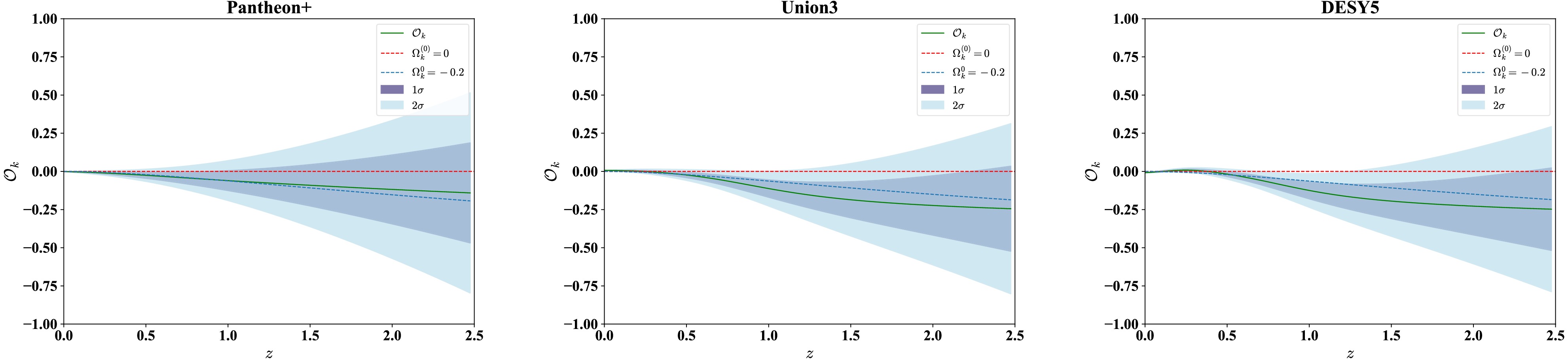 $ {\cal{O}}_k(z) $ from three SNe Ia samples. The dashed lines correspond to a universe with$ \Omega_k^{(0)}=0 $ and$ \Omega_k^{(0)}=-0.2 $ , respectively.The reconstruction based on Union3 is consistent with flatness at low redshift but exhibits a systematic downward drift beyond