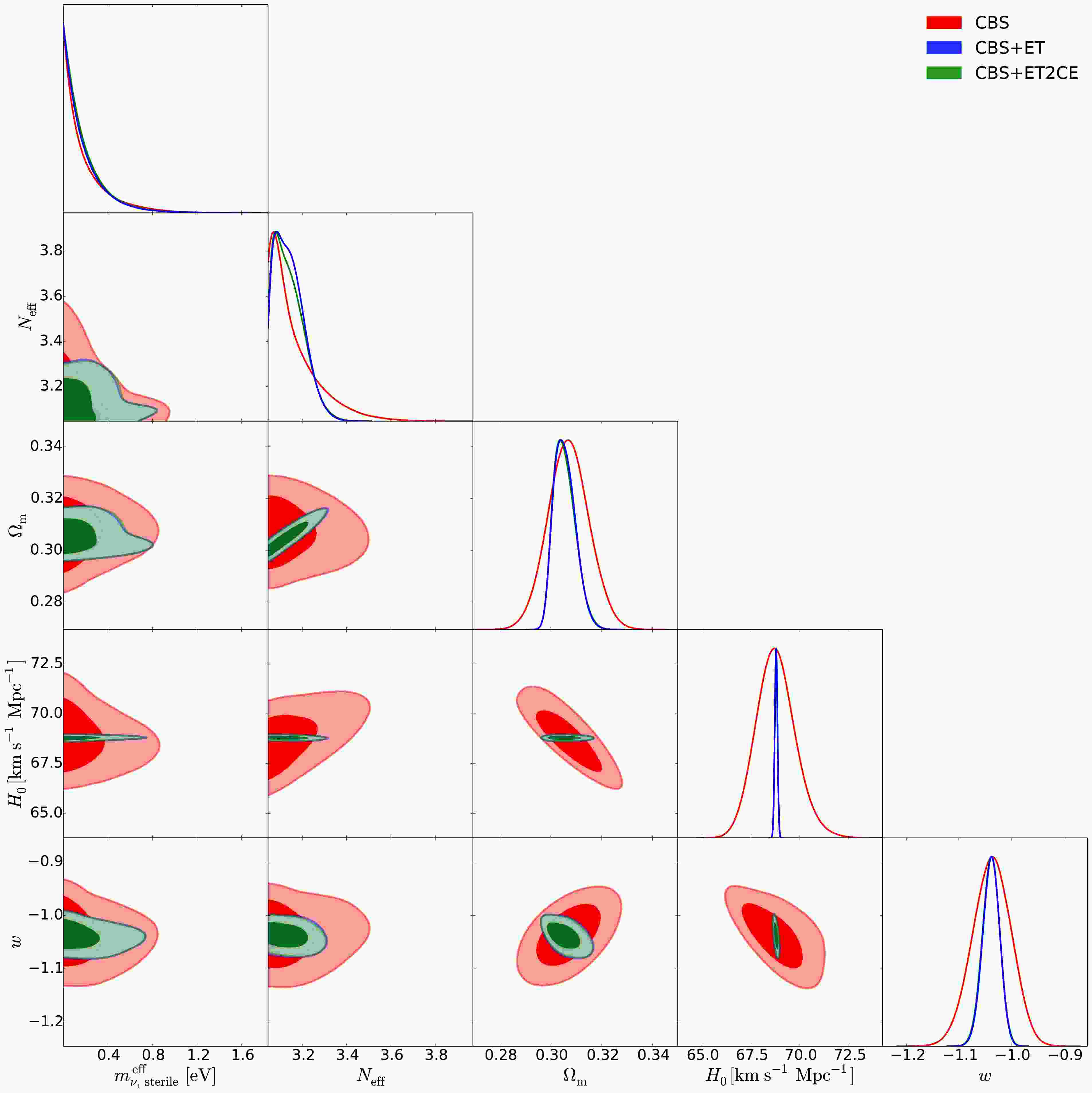 $ \nu_s $ , HDE+$ \nu_s $ and CPL+$ \nu_s $ models using the CBS, CBS+ET, and CBS+ET2CE data combinations. We quote$ \pm 1\sigma $ errors for the parameters, but for the parameters$ N_{\rm{eff}} $ and$ m_{\nu,{\rm{sterile}}}^{\rm{eff}} $ , when central values cannot be determined, we quote the$ 2\sigma $ upper limits. Here,$ H_0 $ is in units of$ {\rm{km}}\ {\rm{s}}^{-1}\ {\rm{Mpc}}^{-1} $ and$ m_{\nu,{\rm{sterile}}}^{\rm{eff}} $ is in units of eV. For a parameter$ \xi $ ,$ \sigma(\xi) $ and$ \varepsilon(\xi)=\sigma(\xi)/\xi $ represent its absolute and relative errors, respectively.Parameter CBS CBS+ET CBS+ET2CE $ \sigma(\Omega_{\rm m}) $ 0.00640 0.00420 0.00405 $ \sigma(H_0) $ 0.7500 0.0540 0.0520 $ \varepsilon(\Omega_{\rm m}) $ 2.055% 1.357% 1.308% $ \varepsilon(H_0) $ 1.101% 0.079% 0.076% $ N_{\rm{eff}} $ <3.3446 $ 3.148^{+0.039}_{-0.094} $ $ 3.150^{+0.042}_{-0.089} $ $ m_{\nu,{\rm{sterile}}}^{\rm{eff}} $ <0.5789 <0.4842 <0.4226 First, we examine how the simulated GW data and properties of DE affect the constraints on sterile neutrino parameters.