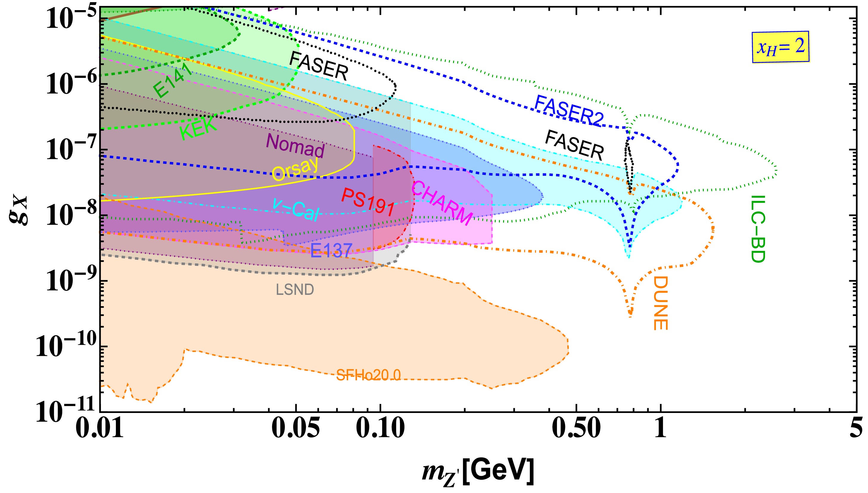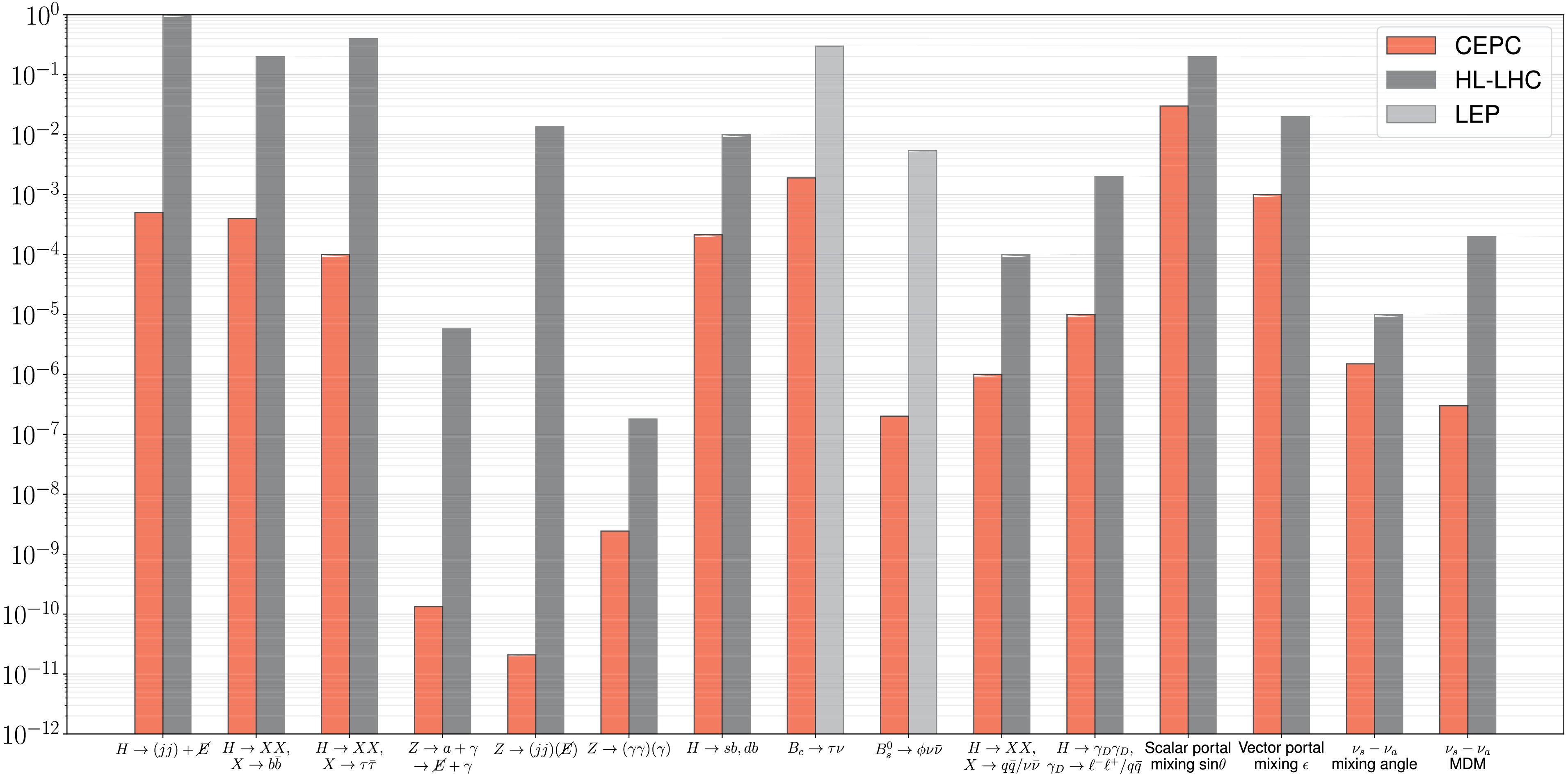 Figure 101. (color online) Projected sensitivities of the CEPC and HL-LHC for various new physics scenarios, including exotic Higgs (first three categories) and Z-boson decays (categories 4-6), flavor-violating Higgs and B-meson decays (categories 7-9), long-lived particle searches (categories 10-11), scalar and vector portal mixing (categories 12-13), as well as sterile-active neutrino mixing and magnetic dipole moment interactions (last two categories). For flavor-violating B-meson decay channels, there are existing constraints from LEP only.