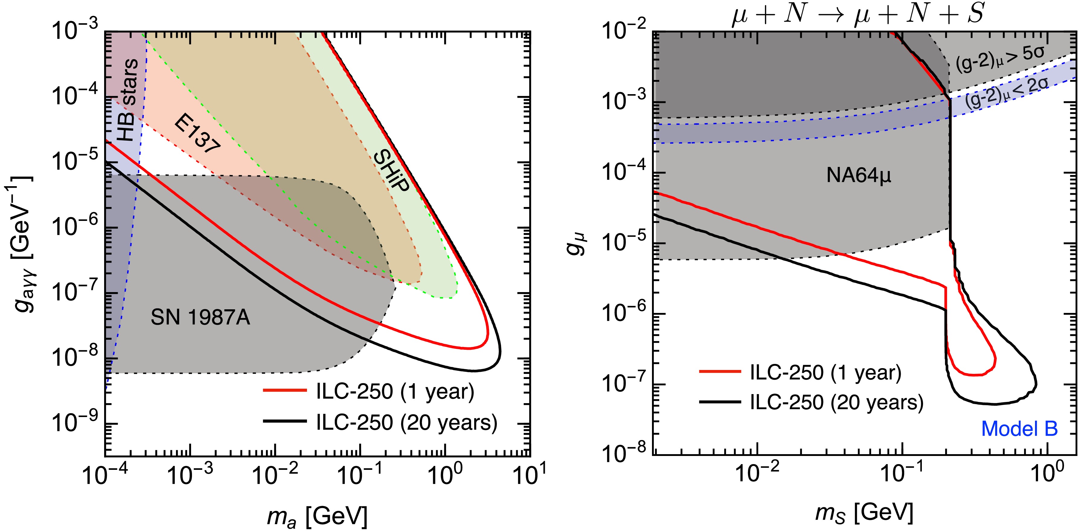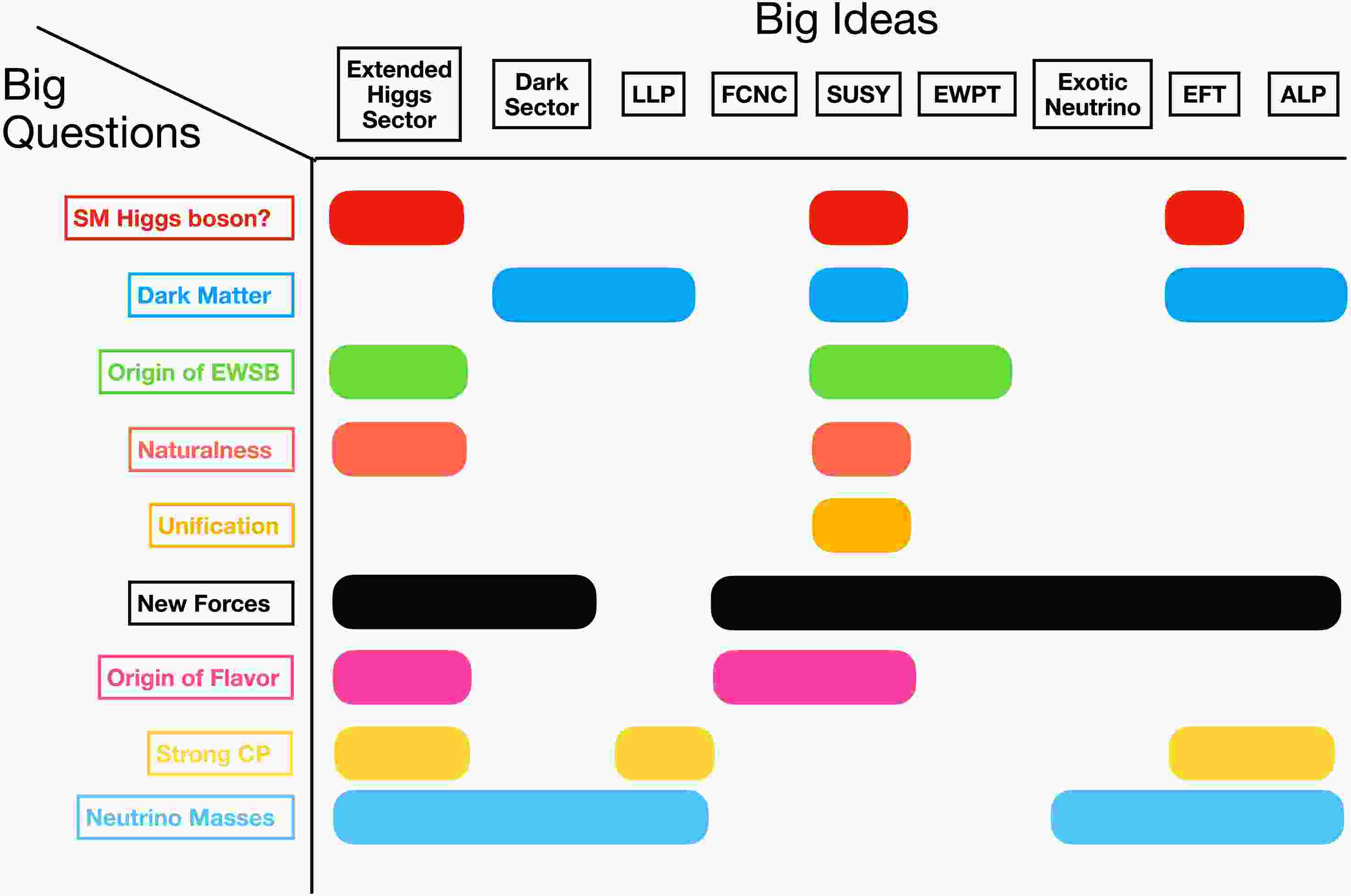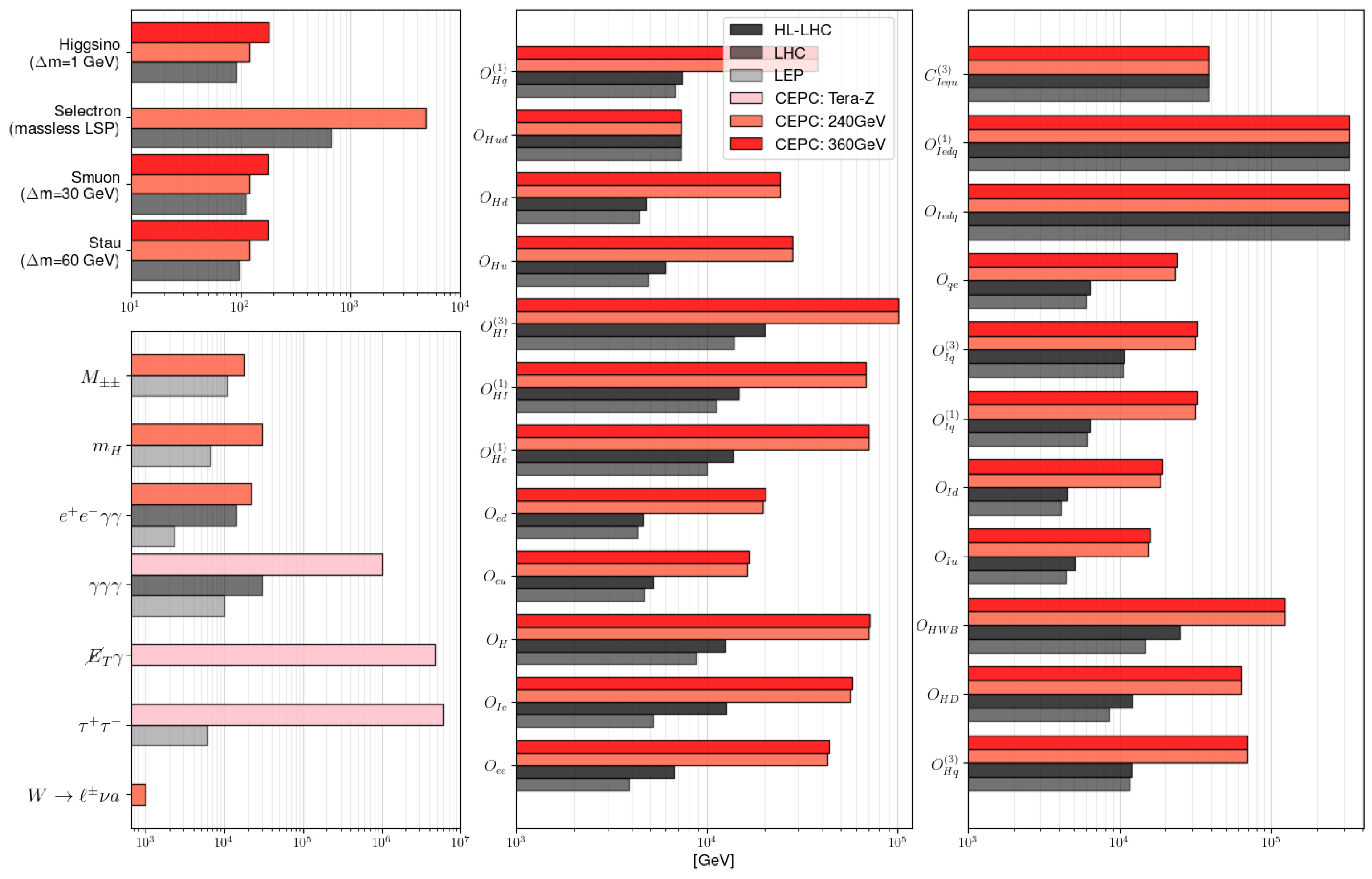 Figure 102. (color online) The typical energy scale of New Physics that could be probed at the CEPC. The left column corresponds to a specialized New Physics Model of SUSY, and exotic New Physics signal searches, including Axion-like particles, and scalar particles in seesaw Models. The middle and right columns correspond to New Physics search via EFT.