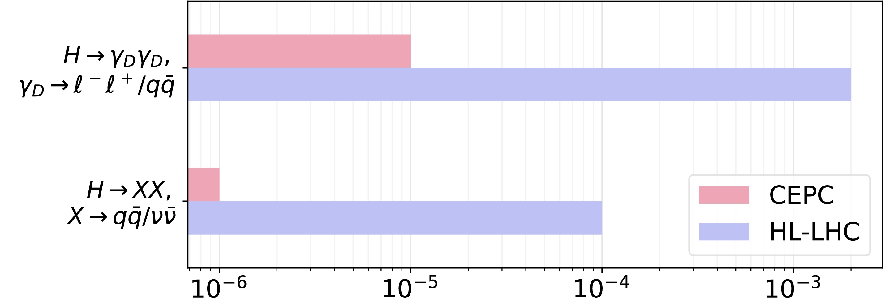 $ 20\; \text{ab}^{-1} $ , the CEPC will achieve unprecedented sensitivity to exotic Higgs decays, constraining branching ratios to: (i)$ \sim 0.1 $ % for fully invisible decays, (ii)$ 0.03 $ %–$ 0.2 $ % for semi-invisible decays, and (iii)$ 0.03 $ %–$ 0.6 $ % for decays to dark sector particles that subsequently decay to SM final states. Fig. 101 presents a comprehensive sensitivity comparison between CEPC and HL-LHC for: semi-invisible decays$ H \to jj+{\not{E}} $ , dark sector decays$ H \to XX $ with$ X \to b\bar{b} $ or$ X \to \tau^+\tau^- $ . The cleaner lepton collider environment at CEPC provides 2–3 orders of magnitude improvement in fully visible channels, while its superior missing energy reconstruction enables 2–4 orders of magnitude better sensitivity for fully invisible and semi-invisible channels compared to HL-LHC.