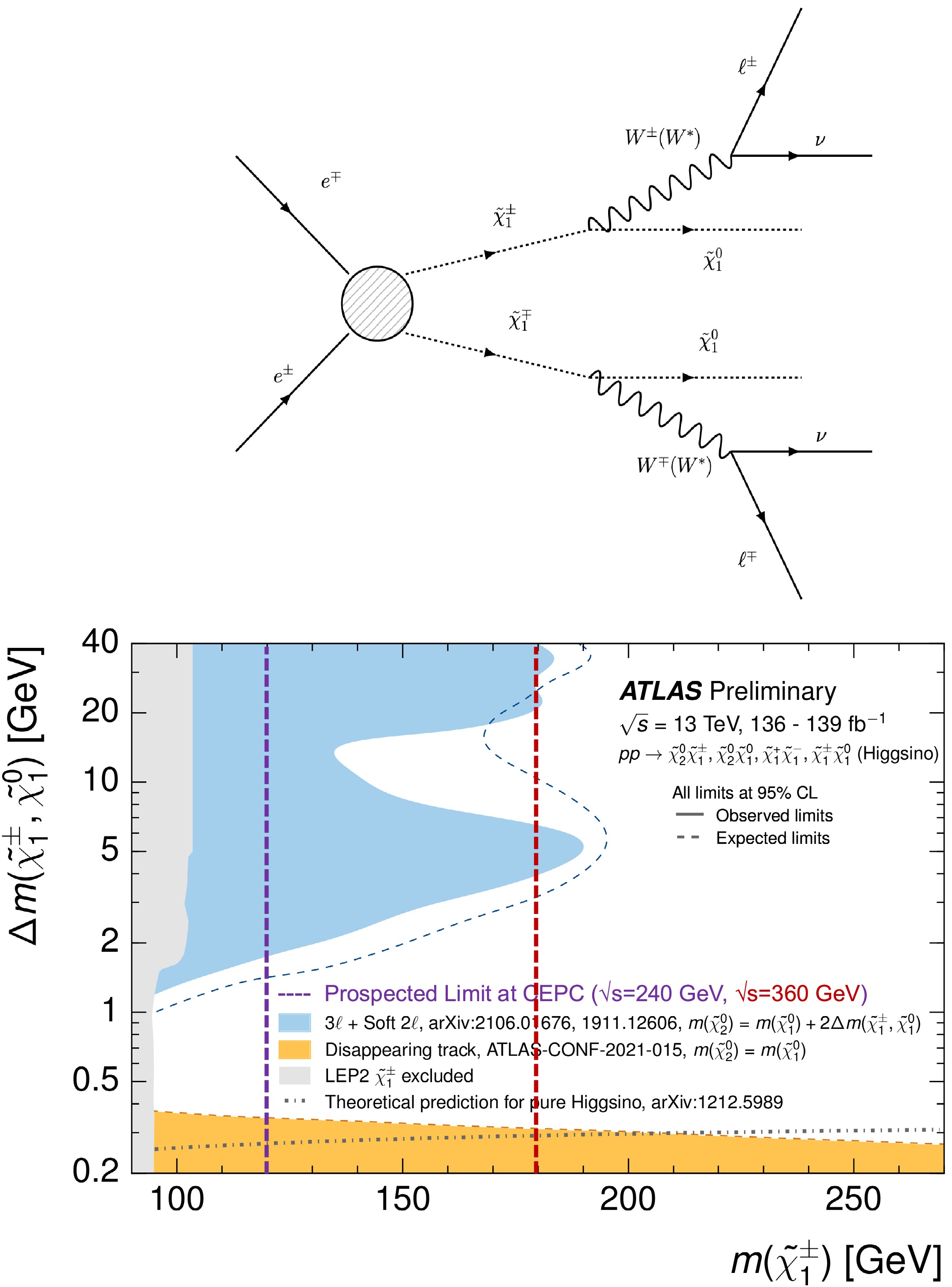 The new physics discovery power could also be expressed in the explorable energy range. Using the SMEFT framework and considering the high precision measurements on EW and Higgs sectors, the CEPC could explore the New Physics with an energy scale of 10–100 TeV, which is roughly one order of magnitude higher than that of the HL-LHC. CEPC is sensitive to the SUSY Particles with mass scale range from the beam energy up to 5 TeV (for the SUSY partner of the electron could be detected via t-channel exchanges). CEPC is sensitive to the New Physics at an energy scale much higher than the center-of-mass energy, for example, it could explore new physics with an energy scale of