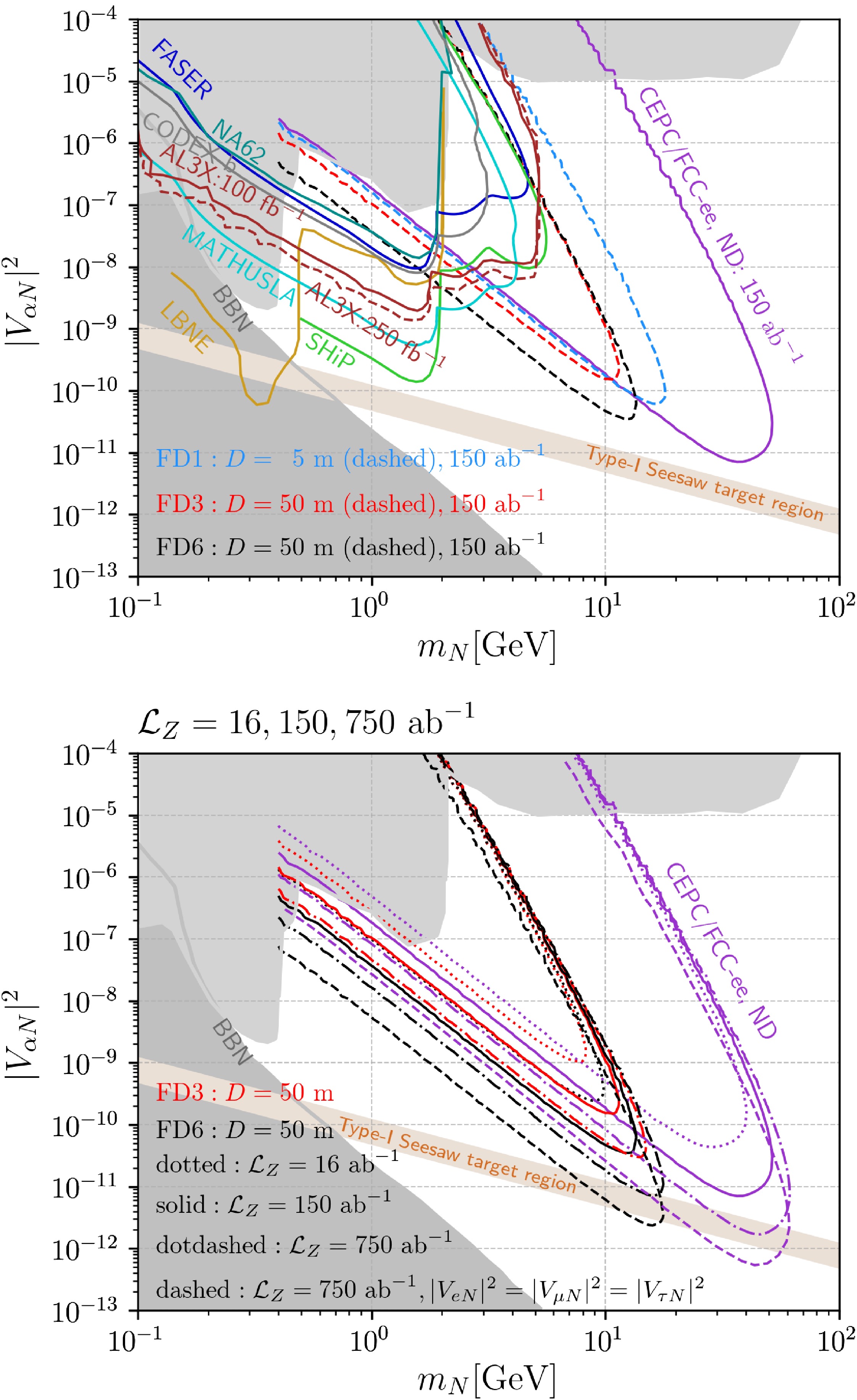 $ Z \to \ell \ell' $ . Additionally, the CEPC will allow for a highly precise examination of tau lepton charge lepton flavor violation decays, achieving sensitivity improvements of approximately two orders of magnitude. Sensitivity to rare B,$ B_s $ , and$ B_c $ meson decays via FCNC processes can also be improved by 2–3 orders of magnitude, particularly in cases where the final state involves a τ lepton. In Fig. 101, we show the branching ratio sensitivity comparison for the flavor-violating Higgs decay$ H \to sb,db $ and the B meson decays$ B_c \to \tau \nu $ and$ B_s^0 \to \phi \nu\bar{\nu} $ , where CEPC projected sensitivities are significantly better than HL-LHC and LEP experiments.Neutrino masses and oscillations require BSM physics, and the CEPC can play a significant role in exploring these phenomena. The CEPC can complement existing studies by covering parameter spaces for sterile neutrinos and non-standard neutrino interactions. With its high integrated luminosity at the Z-pole and Higgs associated production, combined with a clean experimental environment, the CEPC can achieve superior sensitivity in detecting displaced sterile neutrinos from Z and Higgs decays, surpassing the capabilities of the HL-LHC. Additionally, with potential main detector setups and far detector options, the CEPC could further enhance its reach. In Fig. 101, the transition dipole operator for sterile neutrinos, particularly for masses above the GeV scale, and the active neutrino mixing can be the most effectively probed at CEPC, providing sensitivity improvements by three and one orders of magnitude respectively compared to HL-LHC.