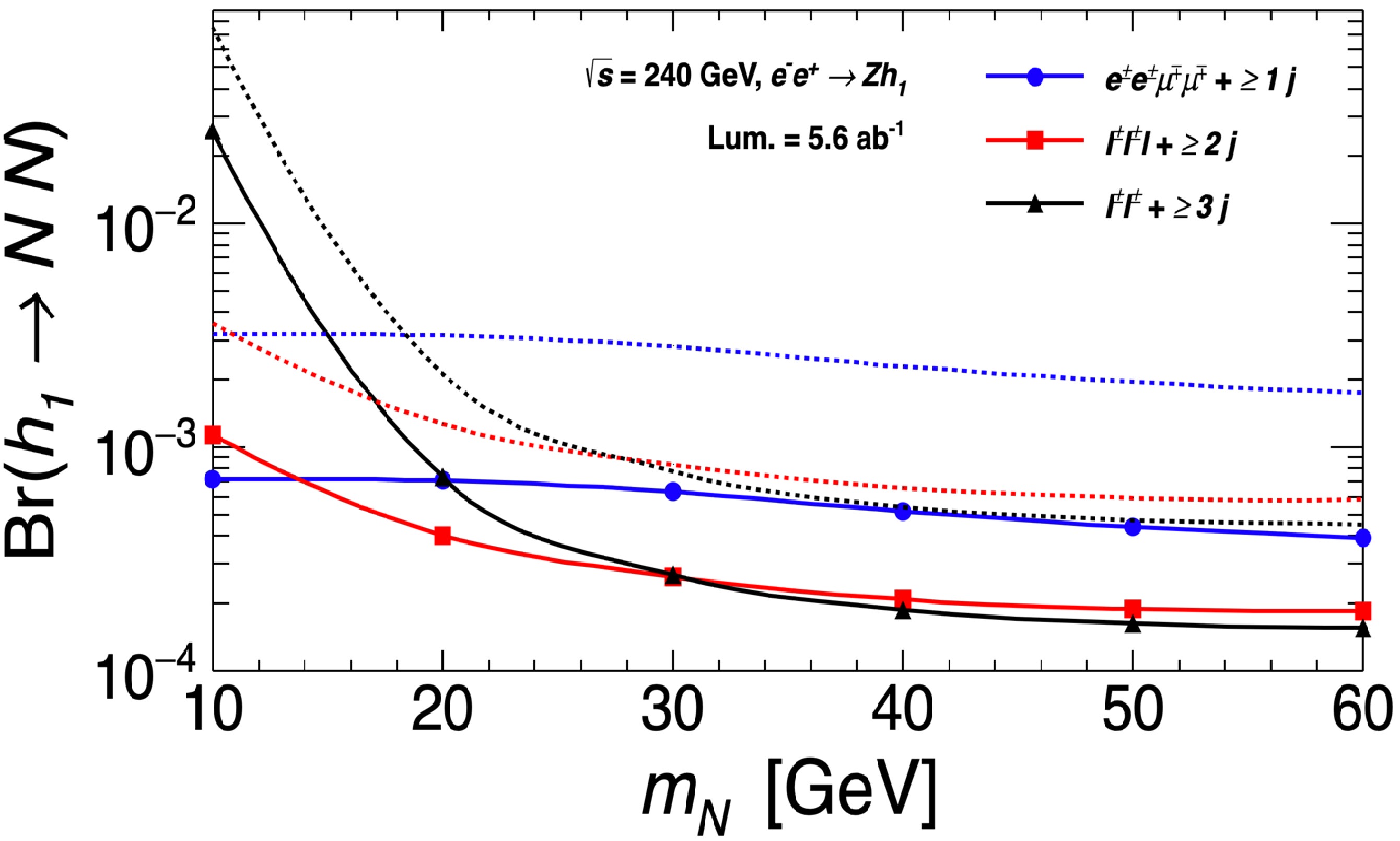 $ 20\; \text{ab}^{-1} $ , the CEPC will achieve unprecedented sensitivity to exotic Higgs decays, constraining branching ratios to: (i)$ \sim 0.1 $ % for fully invisible decays, (ii)$ 0.03 $ %–$ 0.2 $ % for semi-invisible decays, and (iii)$ 0.03 $ %–$ 0.6 $ % for decays to dark sector particles that subsequently decay to SM final states. Figure 101 presents a comprehensive sensitivity comparison between CEPC and HL-LHC for: semi-invisible decays$ H \to jj+{\not E} $ , dark sector decays$ H \to XX $ with$ X \to b\bar{b} $ or$ X \to \tau^+\tau^- $ . The cleaner lepton collider environment at CEPC provides 2–3 orders of magnitude improvement in fully visible channels, while its superior missing energy reconstruction enables 2–4 orders of magnitude better sensitivity for fully invisible and semi-invisible channels compared to HL-LHC.