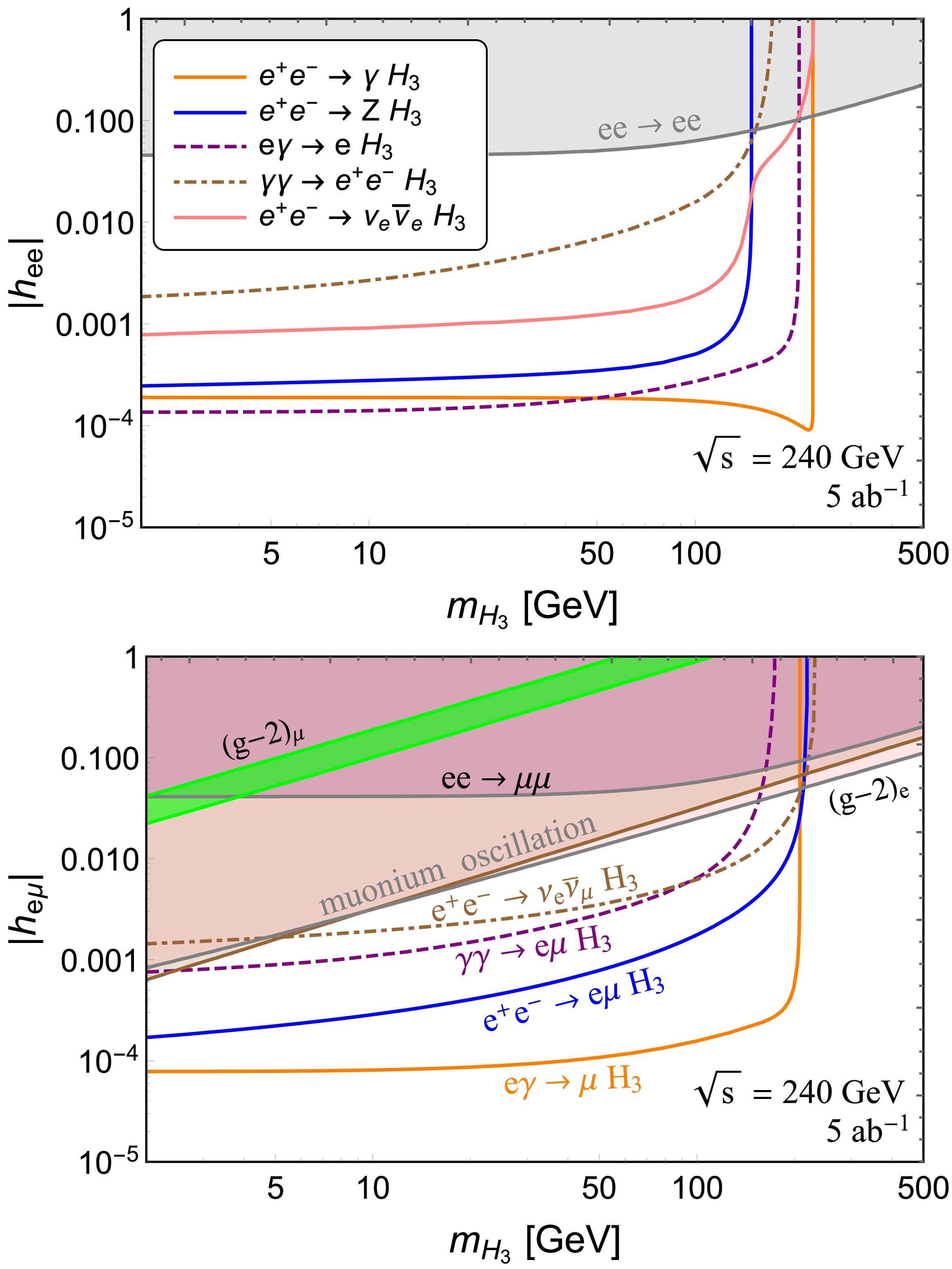 $ 4\ell $ "), semileptonic four-fermion operator induced physics ("$ 2\ell2q $ "), and Higgs physics ("Higgs"). -