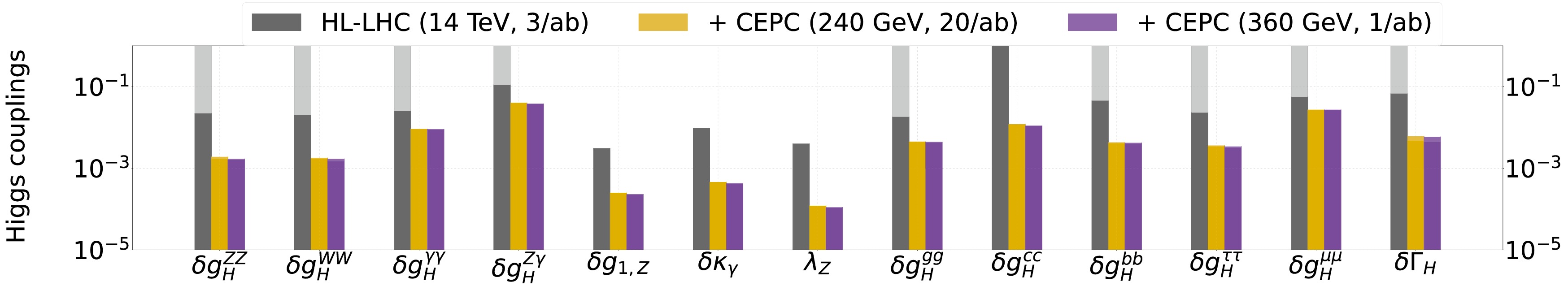 $ 1\sigma $ relative uncertainties on the SMEFT operators as shown along the horizontal axis from a global analysis of the Higgs couplings. The light bars are obtained by taking the total Higgs decay width$ \Gamma_H $ as a free parameter, and the dark bars those with a constrained$ \Gamma_H $ .