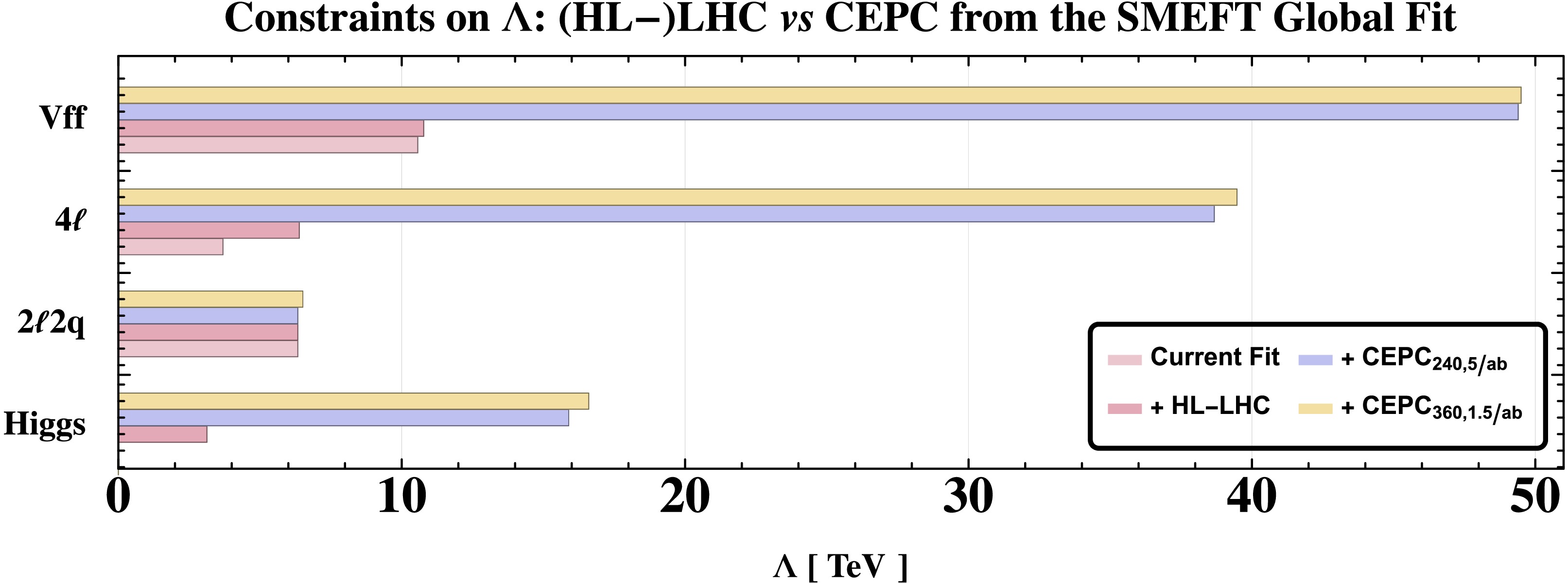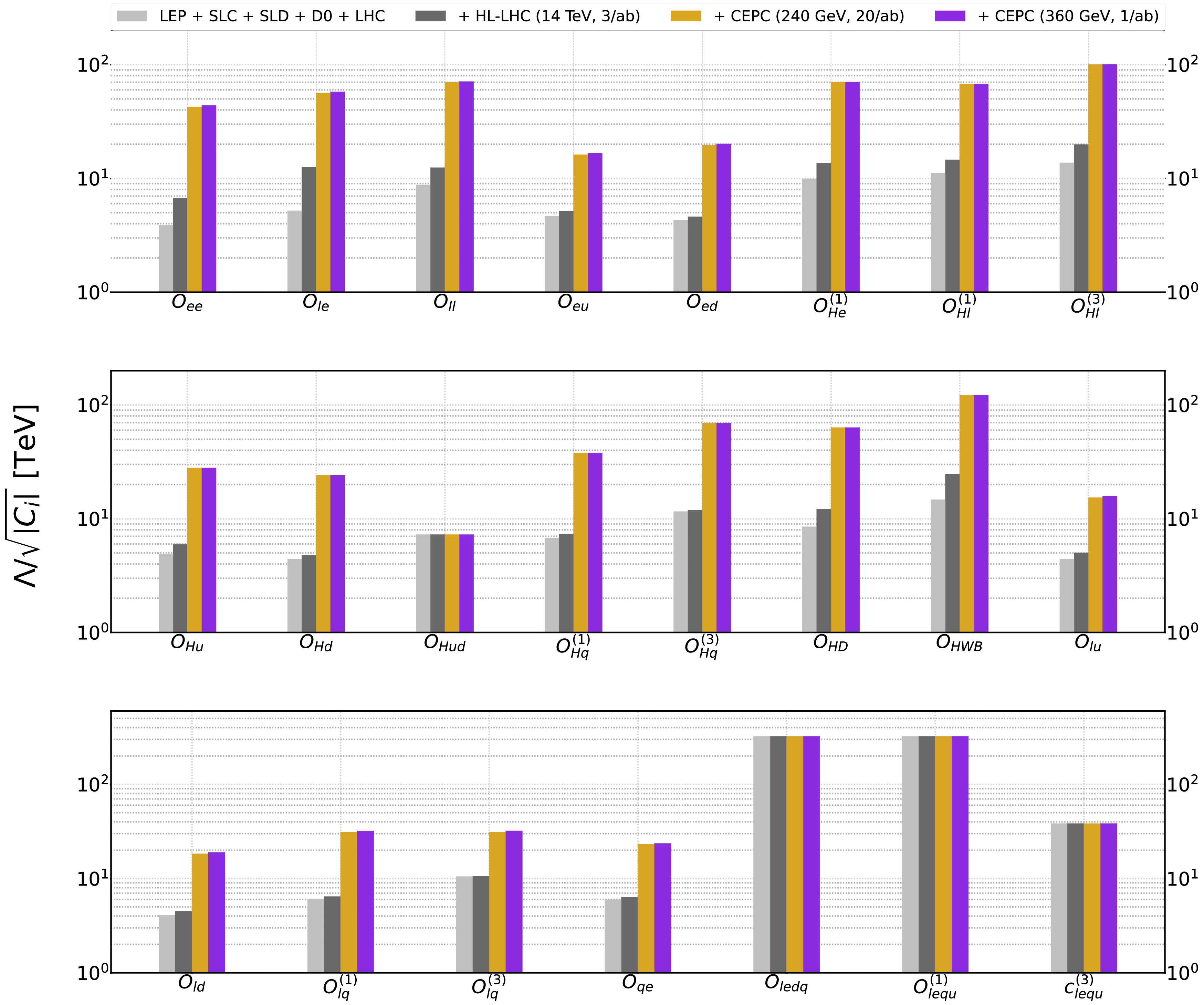 $ 1\sigma $ relative uncertainties are shown for the LHC, HL-LHC, and CEPC with the center-of-mass energy$ \sqrt s = 240\,(360){\rm\,GeV} $ and the integrated luminosity$ {\cal L} = 20\,(1){\rm\,ab^{-1}} $ . Figure 94 clearly shows that CEPC can improve the Higgs couplings by a factor of a few, or even orders of magnitude as can be seen, for example, for the triple gauge couplings$ \delta g_{1,Z} $ ,$ \delta \kappa_\gamma $ , and$ \lambda_Z $ . The sensitivity reach of CEPC to leptonic electroweak vertices can be generically reduced down below the unprecedented$ 10^{-4} $ level as shown in the first row of Fig. 95, thanks to the high-luminosity of CEPC and radiative return to the Z pole from initial state radiation. The corresponding sensitivity to the hadronic electroweak vertices can also be improved by a few, or even an order of magnitude better as for$ \delta g_{Z,L/R}^{bb} $ for instance. For the 4-fermion operators, CEPC can generically reduce the current uncertainties, as shown explicitly in the last five rows of Fig. 95. In particular, for the semi-leptonic operators, the global fit results with the inclusion of CEPC can be improved by$ {\cal{O}}(10\sim10^2) $ for the 2nd and 3rd generation quarks due to tagging efficiencies of heavy quarks at CEPC. These stronger constraints as expected for CEPC will on the other hand also impose new challenges on the theoretical side, for example, theoretical uncertainties on the effective number of relative species during neutrino decoupling in the early Universe [776, 777]. These current theoretical errors will have to be further reduced at the CEPC era to match the precision of CEPC. In summary, CEPC can dramatically increase the sensitivity to Higgs, electroweak, and 4-fermion operators thanks to its high energy and luminosity, and as a result, enhancing its ability in discovering new physics at the 10$ \sim $ 70 TeV scale that could show up in either the Higgs, electroweak, or the 4-fermion sector as seen in the summary plot of Fig. 96. For reference, the lower bounds on the new physics scale$ \Lambda/\sqrt{|C_i|} $ are also shown in Fig. 97 by switching to the Warsaw basis [772] and at the 95% CL. To obtain these results, we assume flavor universality and one operator at a time. In this figure, the light gray bar represents the constraints from the current data with the inclusion of$ A_{FB} $ for neutral Drell-Yan processes at the LHC [778], and the gray bar that with the inclusion of$ A_{FB} $ at the HL-LHC [779]. The last two bars correspond to the sensitivity of CEPC with$ \sqrt s= 250 $ GeV and 360 GeV, respectively. In general, we find it feasible for CEPC to improve the new physics scale by a factor of 3$ \sim $ 10 except for the$ O_{Hud} $ ,$ O_{ledq} $ ,$ O_{lequ}^{(1)} $ and$ O_{lequ}^{(3)} $ operators due to missing projections from the CKM unitarity and flavor physics. Finally, we comment on the global analysis of bosonic CP violating SMEFT operators at dimension 6, which will be important to understand the origin of matter-antimatter asymmetry of our Universe. In [775], it was shown that CEPC could provide a complementary probe compared with that from the (HL-)LHC, and the new physics scale can be constrained to be above$ \sim2.5 $ TeV. Furthermore, recent analyses in [780, 781] based on the angular distribution of$ e^+e^-\to Z \gamma $ with subsequent hadronic and leptonic Z decay found that CEPC could even constrain the CP-violating dimension-8 SMEFT operators to be around$ \sim1 $ TeV, assuming one operator at a time and a center-of-mass energy at 250 GeV and an integrated luminosity of 5$ {\rm ab}^{-1} $ . This highlights the opportunity of studying CP violation at the CEPC.