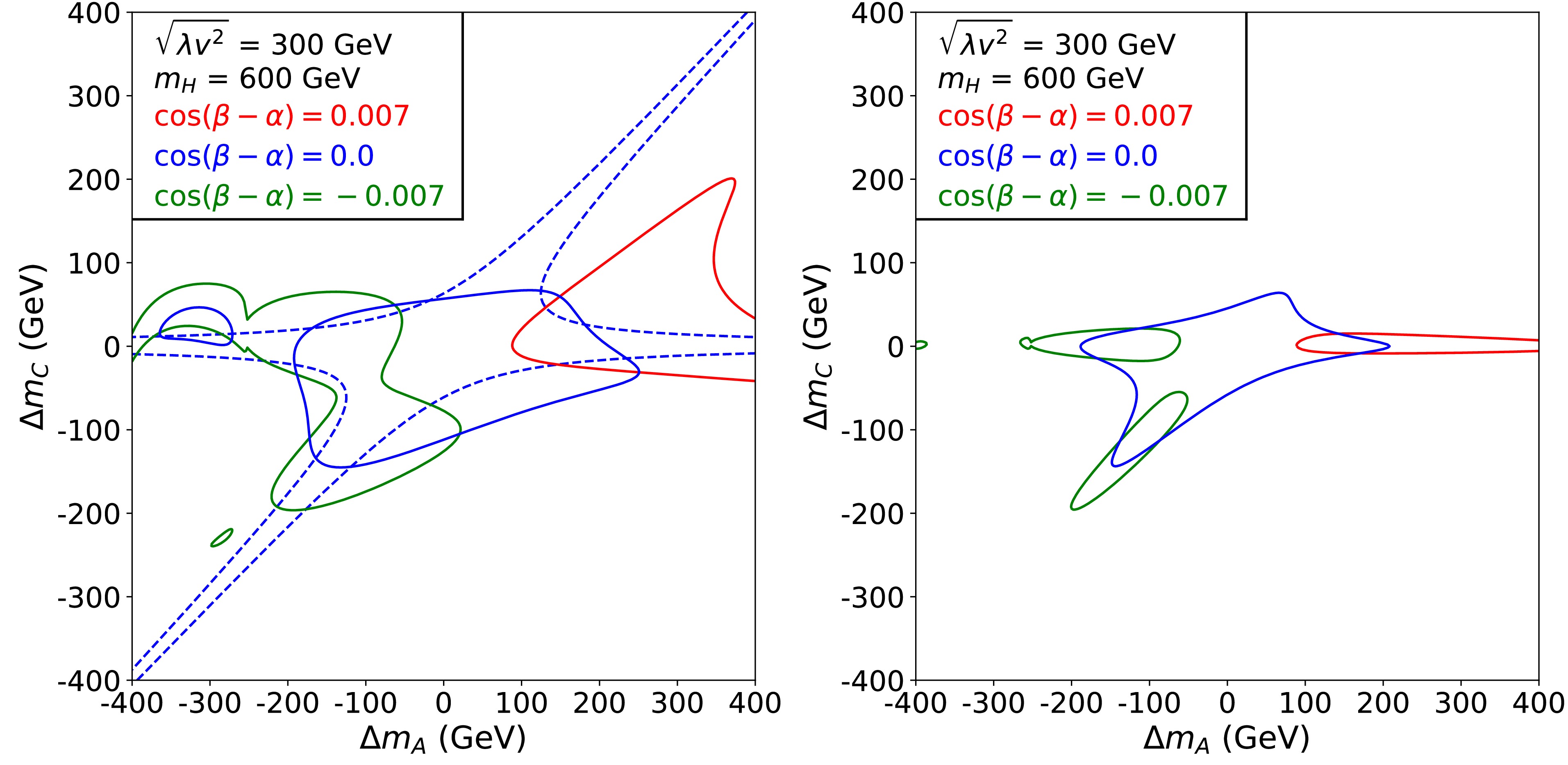 $ m_A=m_H=m_{H^\pm}=m_\Phi $ are assumed such that Z-pole precision measurements are automatically satisfied. Black, red, blue and green curves are for model parameter$ \sqrt{\lambda v^2}= \sqrt{m_\Phi^2-m_{12}^2/s_\beta c_\beta}=0 $ , 100,200, and 300 GeV, respectively. The tree-level only global fit results are shown by the dashed black lines for comparison.$ |\cos(\beta-\alpha)| $ is typically constrained to be less than about 0.008 for$ \tan\beta\sim 1 $ . For smaller and larger values of$ \tan\beta $ , the allowed range of$ \cos(\beta-\alpha) $ is greatly reduced. Loop effects from heavy Higgses tilt the value of$ \cos(\beta-\alpha) $ towards negative, especially in the large$ \tan\beta $ region.Going beyond the degenerate mass case, both the Higgs and Z-pole precision variables are sensitive to the mass splittings between the charged Higgs and the neutral ones. Figure 99 shows the 95% C.L. range of