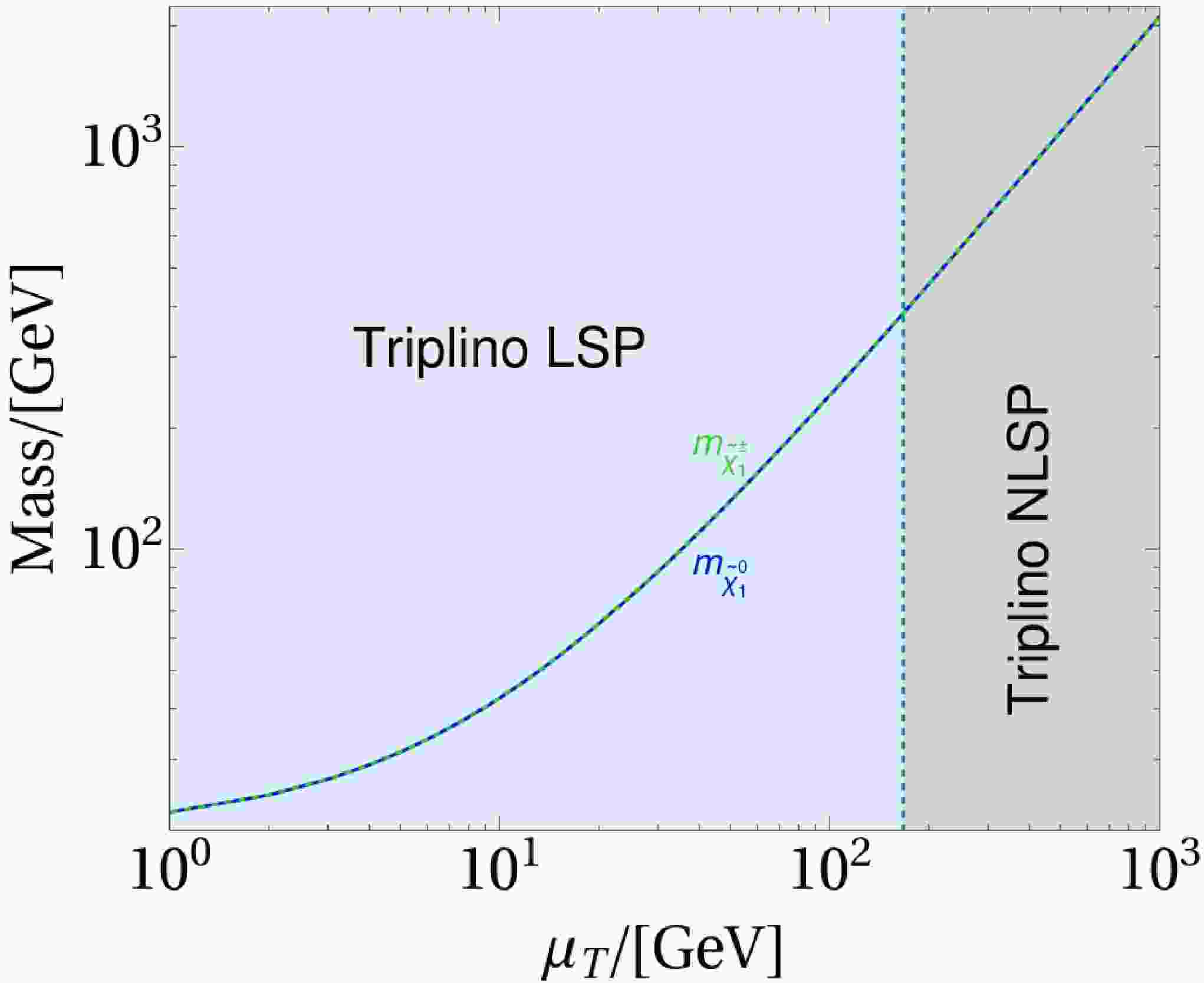 Figure 5.  (color online) The masses of the charged triplino and neutral triplino as a function of $ \mu_T $, and the status for the LSP.
