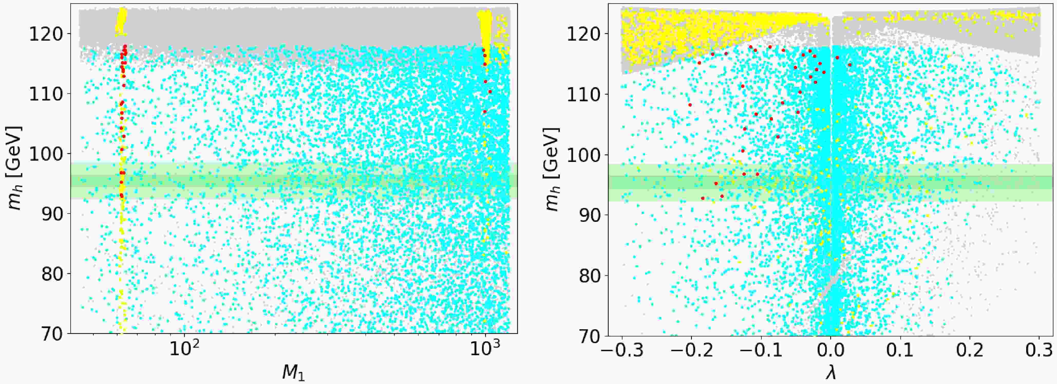 ● Cyan points – Higgs constraints: The SM Higgs mass lies within the experimentally allowed range and satisfies all HB, HS and SModelS constraints.