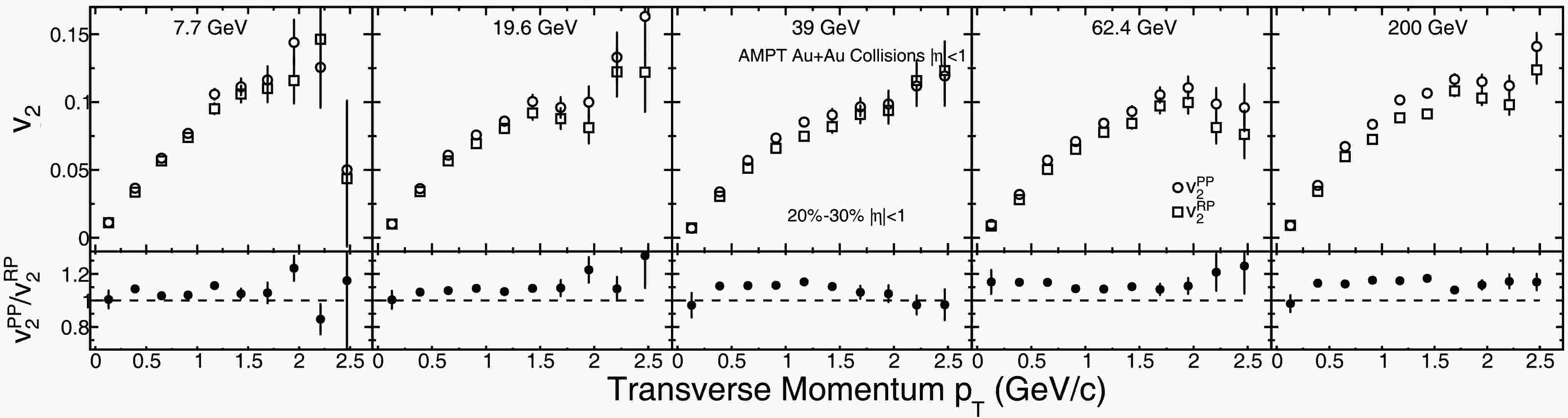 The remainder of this paper is organized as follows. In Sec. II, we briefly describe the basic features of the AMPT model. Sec. III presents the transverse momentum ($ p_T $) dependence of $ v_{2}^{\text{PP}} $, $ v_{2}^{\text{RP}} $, and their ratio $ v_{2}^{\text{PP}} $/$ v_{2}^{\text{RP}} $, along with discussions on the centrality and collision energy dependence of the ratio. Finally, a summary of the main finding is provided in Sec. IV.