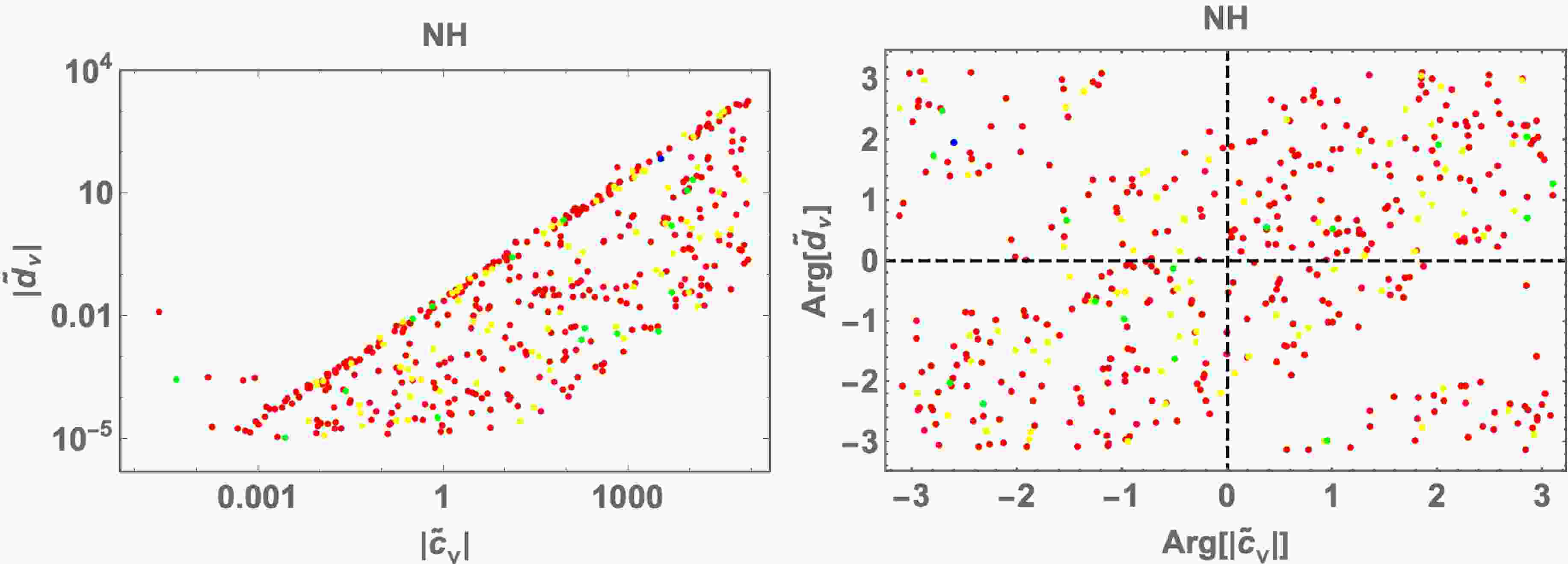 $ \tilde d_\nu $ and$ \tilde c_\nu $ in NH. We find that the allowed region is about$ |\tilde c_\nu|=[10^{-4}-10^{5}] $ and$ |\tilde d_\nu|=[10^{-5}-10^{4}] $ where$ |\tilde{d}_\nu | \ll |\tilde{c}_\nu | $ is preferred, and$ {\rm{Arg}}[\tilde c_\nu] $ and$ {\rm{Arg}}[\tilde d_\nu] $ can be any value with little correlation.