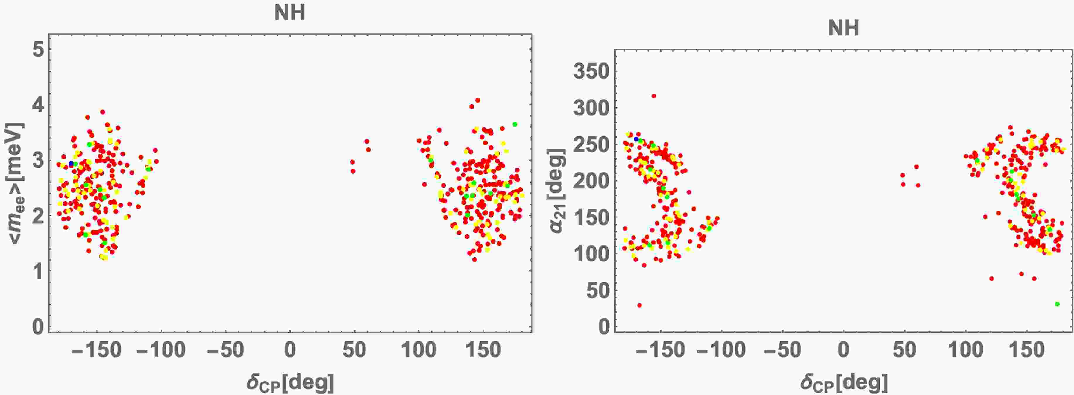 $ \langle m_{ee}\rangle $ meV (left) and$ \alpha_{21} $ deg (right) in terms of$ \delta_{CP} $ deg in NH. We find the allowed region of$ \alpha_{21} $ is concentrated around$ [80-270] $ deg with few points outside the region.