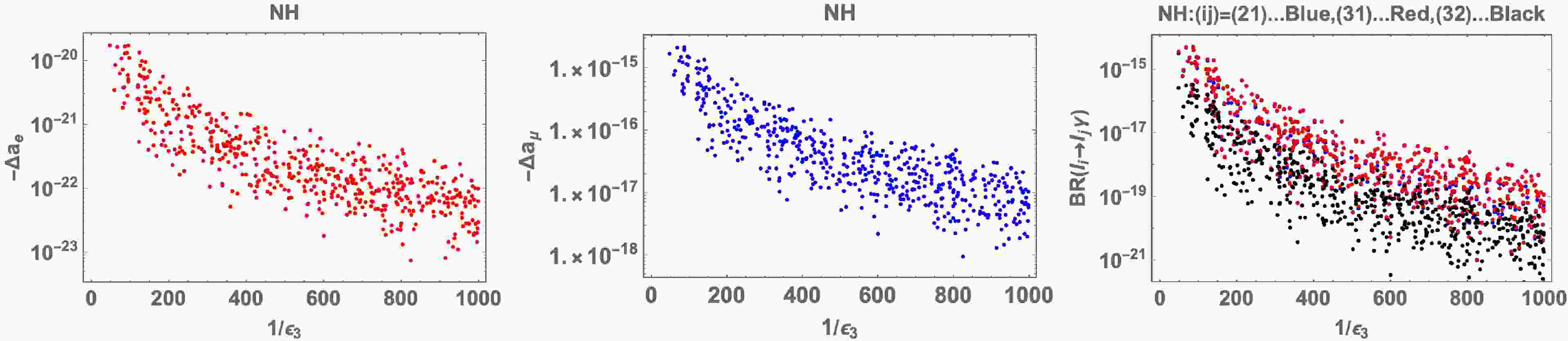$ g-2 $ , muon$ g-2 $ , and LFVs, as shown in Fig. 5. These figures suggests that$ -\Delta a_e $ and$ -\Delta a_\mu $ are at most$ 10^{-20} $ and$ 10^{-15} $ , respectively. However, LFVs, especially the$ \mu\to e\gamma $ branching ratio, would be testable in the near future because its maximum value is close to the experimental limit. -