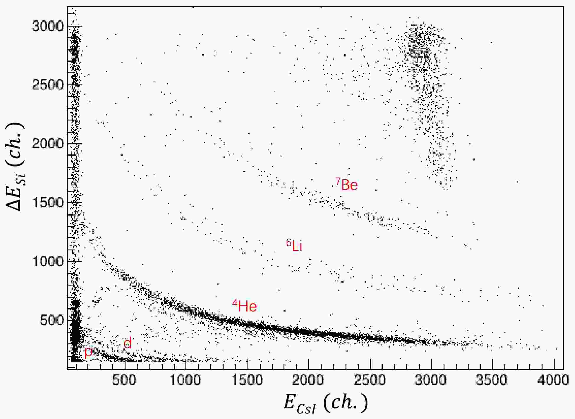 Figure 2.  (color online) Particle identification (PID) using a ΔE DSSD silicon detector and an E CsI(Tl) scintillator detectors array.
