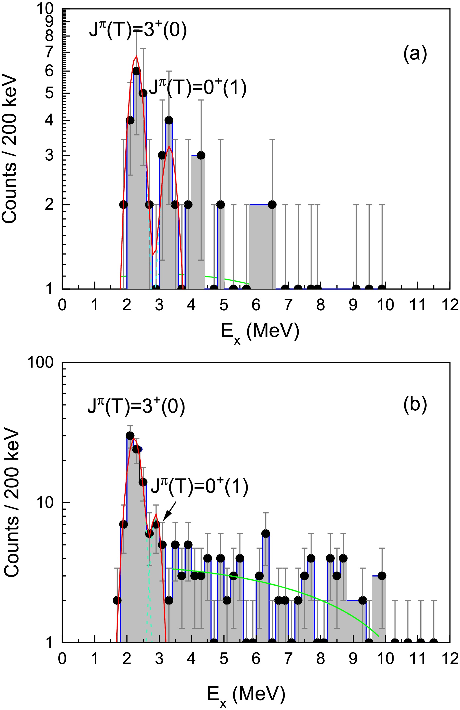 Figure 3.  (color online) Excitation energy spectra of $ ^{6} $Li$ ^* $: (a) Under the cut of $ \Theta_{CM}<120^{\circ} $, where $ \Theta_{CM} $ is the relative emission angle between d and α in the center-of-mass system of all the clusters, clear excited states of $ J^{\pi}(T)=3^{+}(0) $ and $ J^{\pi}(T)=0^{+}(1) $ are observed; (b) Under the cut of $ \Theta_{CM}>120^{\circ} $, there is an enhanced population of the $ J^{\pi}(T)=3^{+}(0) $ state, while the $ J^{\pi}(T)=0^{+}(1) $ state maintains a similar population to that in (a). The dashed lines represent the fitting for these resonances with a Breit-Wigner function, and the continuous background is depicted by the green line.