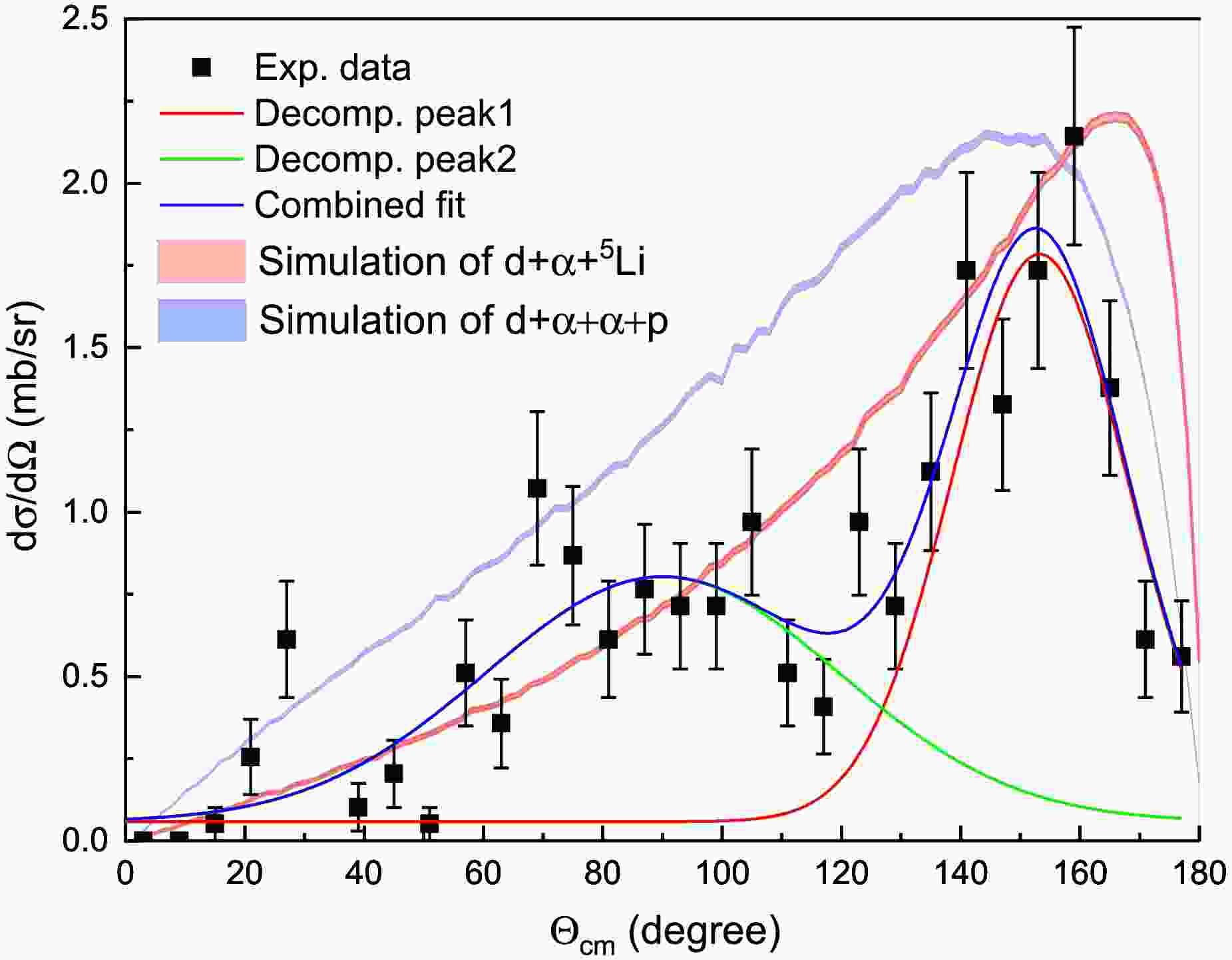 • The excited state of $ ^{6} $Li$ ^* $ was reconstructed by analyzing the invariant mass of final state particles [13, 14], specifically d and α, selected from multiplicity-2 hits events recorded by the zero-degree telescope system. The excitation energy spectra of $ ^{6} $Li$ ^* $ were investigated in two cases, as shown in Fig. 3, based on the relative emitting angle $ \Theta_{CM} $ between d and α in the center-of-mass system of the total cluster system, which is defined in Fig. 4. The first case considered $ \Theta_{CM}<120^{\circ} $, while the second case focused on $ \Theta_{CM}>120^{\circ} $. The angular distribution of $ \Theta_{CM} $ is displayed in Fig. 5.