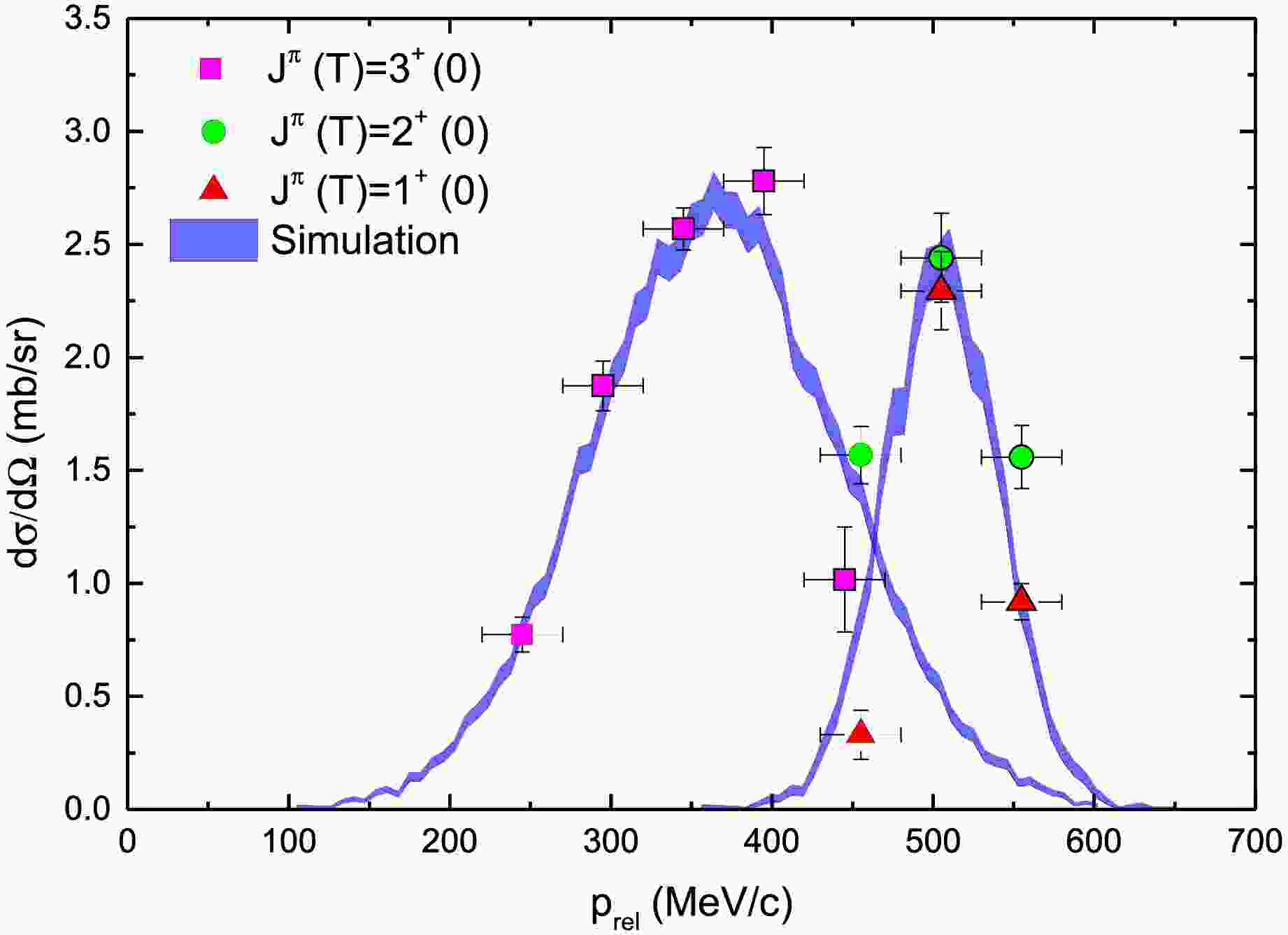 Figure 6.  (color online) The relative momentum $ p_{rel} $ between d and α depends on the spin of the triplet state with T=0. The $ J^{\pi}(T) $=3$ ^{+}(0) $ state lies in the lower $ p_{rel} $ region with a wider width, while the $ J^{\pi}(T) $=2$ ^{+}(0), 1^{+}(0) $ mixed states are located in the higher $ p_{rel} $ region with a narrower width.