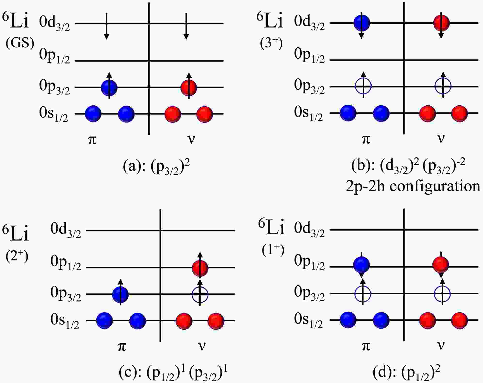 Figure 7.  (color online) Configurations of $ ^{6} $Li for the ground state and excited states of $ J^{\pi} $(T)=3$ ^{+} $(0), 2$ ^{+} $(0), and 1$ ^{+} $(0). Notably, 3$ ^{+} $(0) satisfies the tensor force selection rule of ΔL=2, ΔS=2, and ΔJ=0 and 2p-2h configuration.