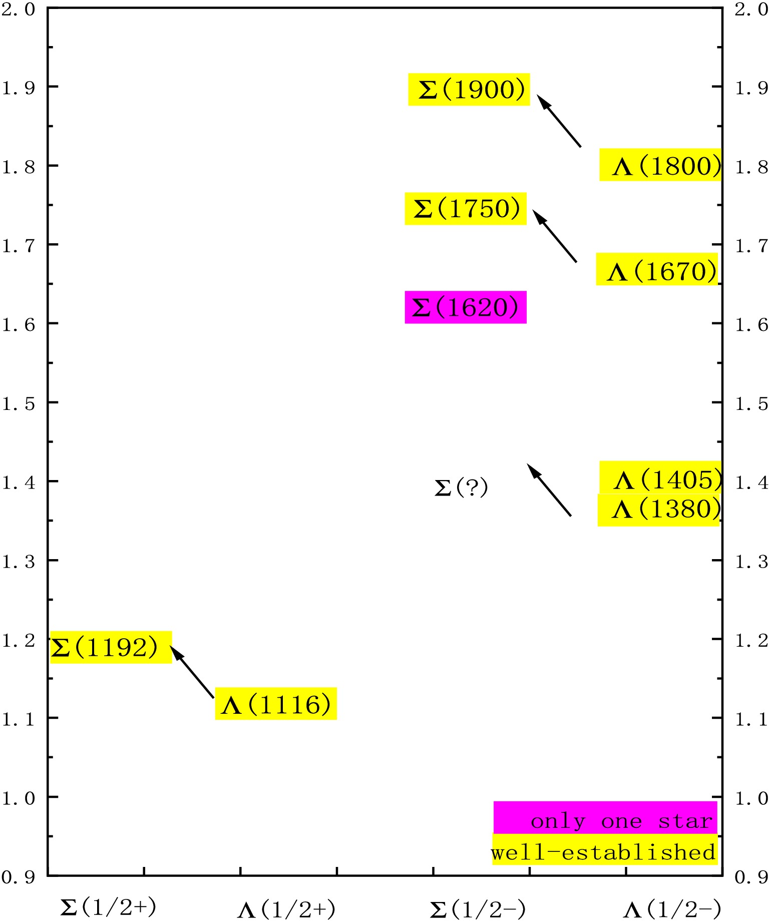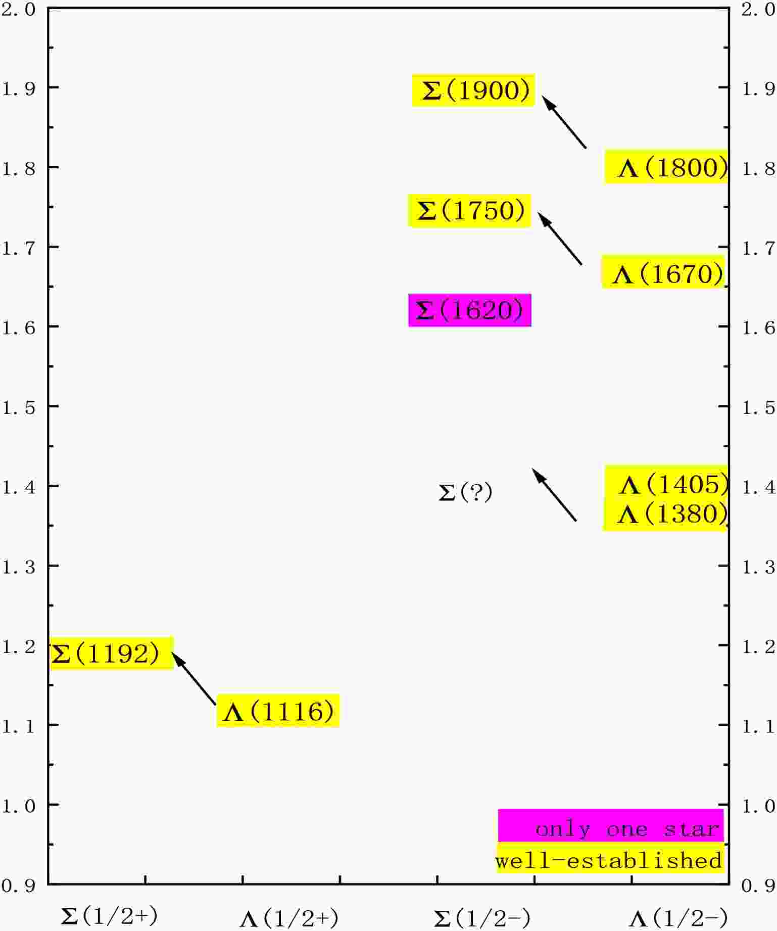 $ \Sigma(1/2^-) $ system have attracted sustained interest. Experimentally, four$ \Sigma(1/2^-) $ states were observed to date [5], namely,$ \Sigma(1620) $ ,$ \Sigma(1750) $ ,$ \Sigma(1900) $ , and$ \Sigma(2110) $ . However, various theoretical studies [6−11] suggested the possible existence of a stable structure in the mass range of$ 1.3 $ −$ 1.4 $ GeV. In Ref. [6], the authors constructed a diquark picture for the pentaquark with$J^{P} = {1}/{2}^{-}$ and predicted the lowest mass of the$ \Sigma(1/2^{-}) $ state to be ~1.36 GeV, while the corresponding lowest$ \Lambda(1/2^{-}) $ state lies at 1.44 GeV. This result is consistent with the observed$ \Lambda(1405) $ . Using the effective Lagrangian approach, Ref. [7] investigated the$ K^{-}p \rightarrow \Lambda \pi^{-} \pi^{+} $ reaction near the$ \Lambda^{*}(1520) $ peak and found evidence for a new resonance around 1.38 GeV. This result was later confirmed in Ref. [8] through a re-examination of older$ K^{-}p \rightarrow \Lambda \pi^{-} \pi^{+} $ data, which further suggested that the width of this resonance could be larger than previously estimated. More recently, Ref. [9] explored the role of triangle singularities in the process$ J/\psi \rightarrow \Lambda \bar{\Lambda} \pi $ . The triangle singularity plays a significant role in shaping the$ \Lambda \pi $ invariant mass spectrum, leading to the appearance of a resonance-like structure around 1.4 GeV. Similarly, within the triangle singularity framework and using an effective Lagrangian approach, Ref. [11] investigated resonance production in the reaction$ \Lambda_c^+ \rightarrow \gamma \pi^+ \Lambda $ , which predicts a resonance near 1.38 GeV. Σ baryons, as isospin partners of the Λ states, exhibit a similar spectral structure. Figure 1 shows that the energy of the$ \Sigma(1/2^+) $ state is ~76 MeV higher than that of the$ \Lambda(1/2^+) $ state. In the$ J^P = 1/2^- $ sector, if we disregard the experimentally uncertain$ \Sigma(1620) $ state (which currently has only a one-star rating), a parallel pattern can be observed:$ \Sigma(1750) $ and$ \Sigma(1900) $ correspond to$ \Lambda(1670) $ and$ \Lambda(1800) $ , respectively. Based on this correspondence, the well-established$ \Lambda(1405) $ and tentative$ \Lambda(1380) $ (though the latter lacks strong experimental confirmation) would naturally imply the existence of a Σ resonance in the mass range of 1.3−1.4 GeV.It is widely accepted that the