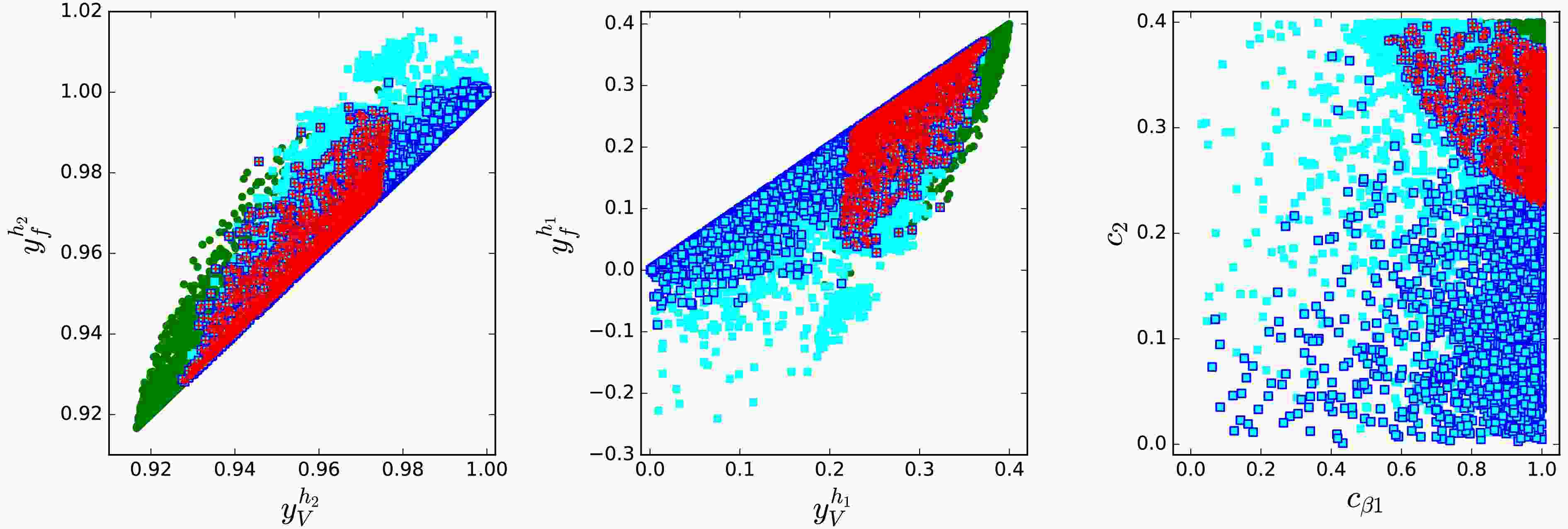 $ h_2 $ is identifed as the observed 125 GeV Higgs boson and$ \textsf{HiggsTools} $ [136] is used to compute the total$ \chi^2_{125} $ based on the latest LHC measurements of signal strength of the 125 GeV Higgs boson.$ \textsf{HiggsTools} $ integrates both$ \textsf{HiggsSignals} $ [136, 137] and$ \textsf{HiggsBounds} $ [138, 139]. In particular, the calculation focuses on the parameter points that satisfy$ \chi^2_{125}-\chi^2_{\rm SM}< $ 6.18, where$ \chi^2_{\rm SM} $ represents the SM prediction value. These points are preferred over the SM at the$ 2\sigma $ confidence level, assuming a two-parameter fit.(4) Searches for additional Higgs boson at the collider and flavor observables.