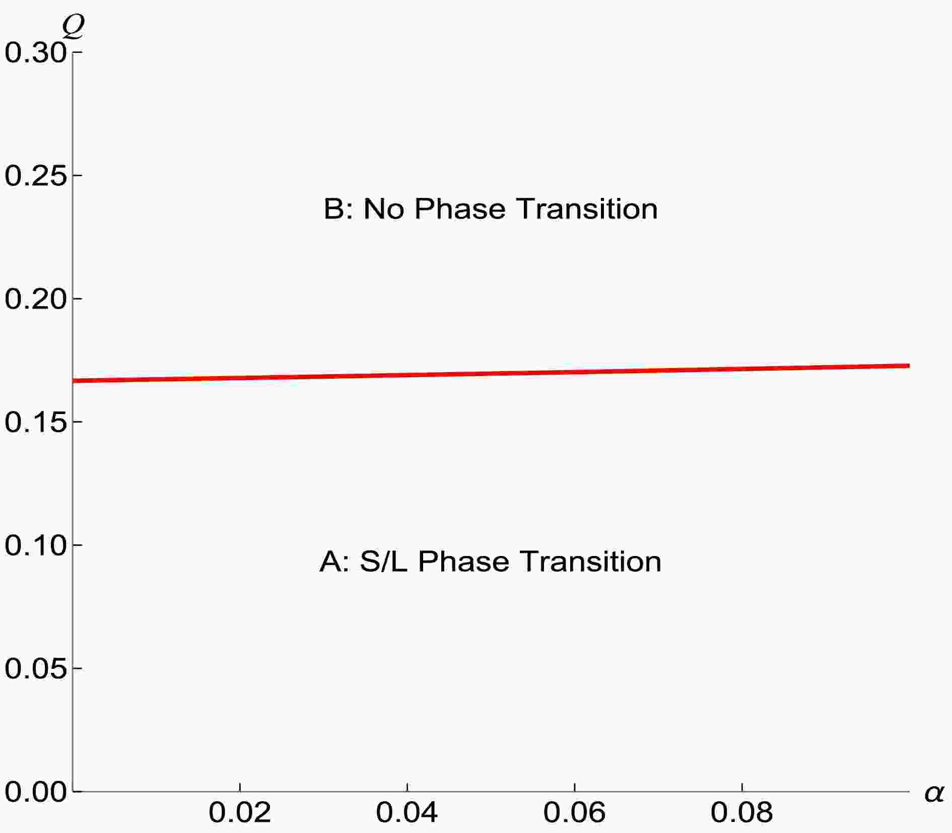 $ Q-\alpha $ ) space is shown in Figure 2. The curve divides the plane into two distinct regions. Region A corresponds to the parameter range in which the BH undergoes a S/L phase transition, while in Region B the BH remains in a stable single phase with no phase transition.From the above equation, we obtained the analytical solution at the critical point,