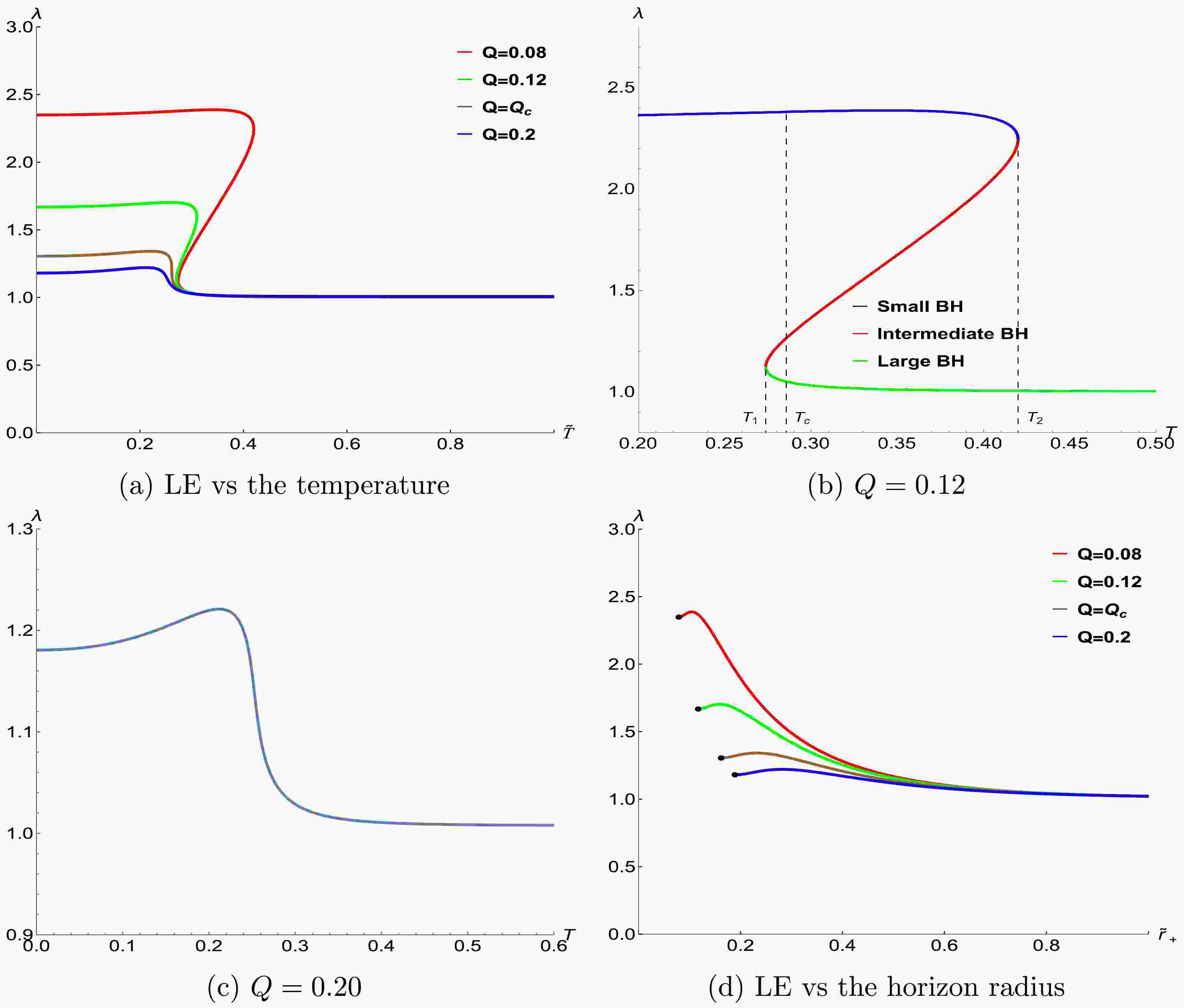 $ {Q}>{Q_c} $ . Conversely, when$ {Q}<{Q_c} $ , maximum values become evident in the plot. This phenomenon implies that the BH undergoes a transition to a multi phase state, with multiple distinct phases coexisting within its structure.