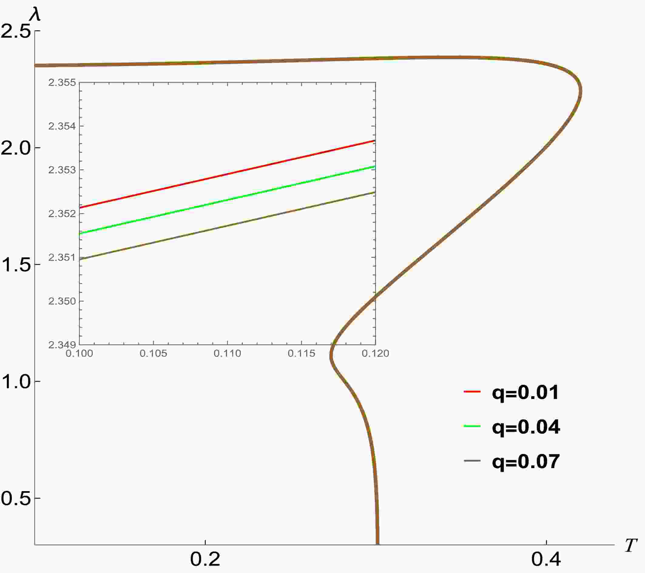 $ {\alpha}=0.04 $ ,$ l=1.00 $ , and get the values at the critical point as follows$ {r}_{+c}=0.411108,\quad {Q}_c=0.168965, \quad {T}_c=0.272423. $