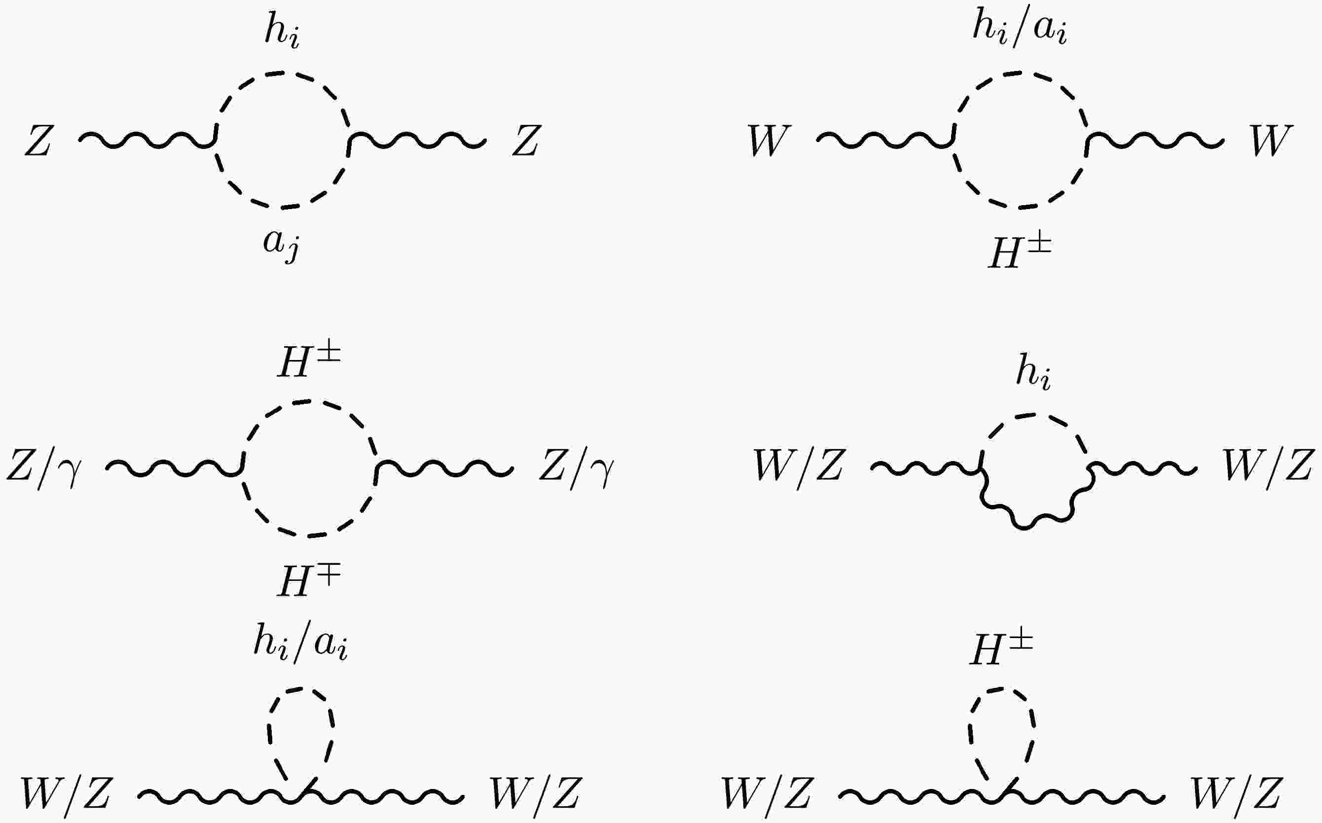 $ h_i VV $ ,$ h_ia_j Z $ ,$ h_i/a_i H^\pm W^\mp $ , and$ Z/\gamma H^\pm H^\mp $ ), as well as the four-point vertices (including$ h_i h_i VV $ ,$ a_i a_i VV $ , and$ H^\pm H^\mp VV $ ), contribute to the self-energies of the gauge bosons.The contributions to the STU parameters from various Higgses can be found in Ref. [22]. Using those expressions, the STU parameters in the 2HDM+S are given by