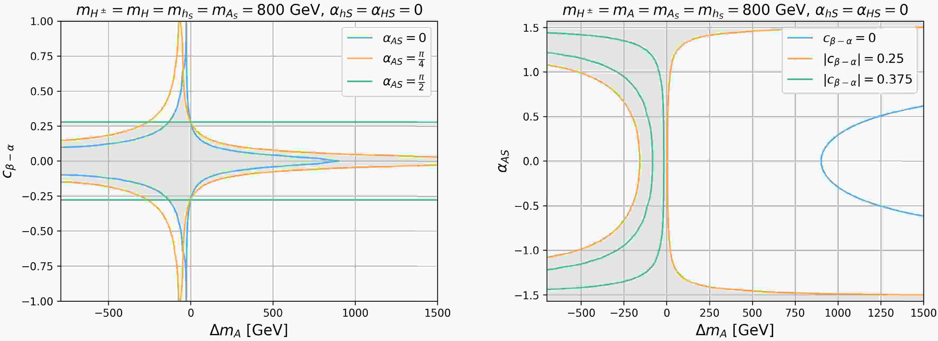 $ \Delta m_{A} $ vs.$ c_{\beta-\alpha} $ plane (left panel) for$ \alpha_{HS} $ =0 (blue),$ \pi/4 $ (orange), and$ \pi/2 $ (green) and the$ \Delta m_{A} $ vs.$ \alpha_{AS} $ plane (right panel) for$ |c_{\beta-\alpha}| $ =0 (blue), 0.25 (orange), and 0.375 (green). We set$ m_{H^\pm}=m_H=m_{h_S}=m_{A_S}=800 $ GeV and$ \alpha_{hS}=\alpha_{HS}=0 $ .The right panel of Fig. 10 presents the 95% C.L. allowed region in