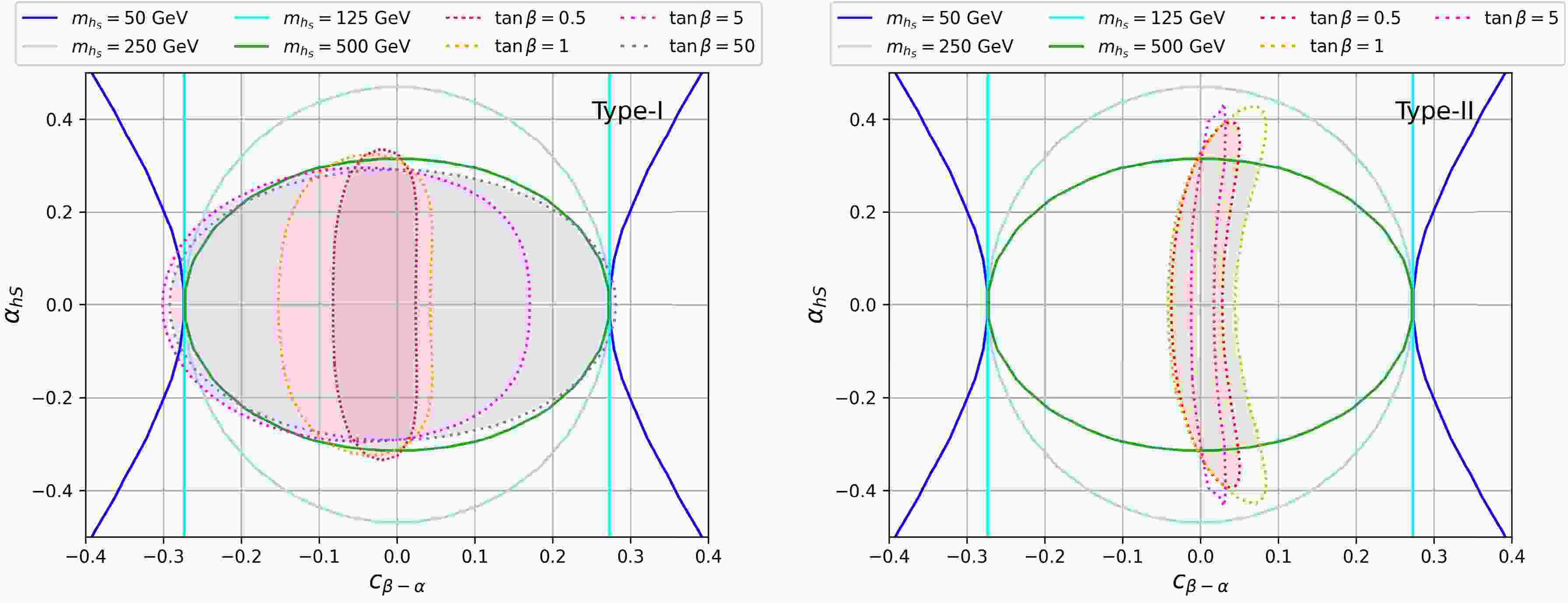 $ c_{\beta-\alpha} $ , the singlet-$ h_{125} $ mixing$ \alpha_{hS} $ , and$ \tan\beta $ . We perform the fit for 125 GeV Higgs properties with$\mathrm{HiggsTools} $ [31−35]. In Fig. 11, we present both the 95% C.L. STU allowed region in the$ c_{\beta-\alpha} $ vs.$ \alpha_{hS} $ plane for various$ m_{h_S} $ (regions enclosed by solid curves) and the 95% C.L. allowed region by 125 GeV Higgs precision measurements for various$ \tan\beta $ (region enclosed by dashed curves) for Type-I (left panel) and Type-II (right panel). As the STU constraints only depend on the couplings of the Higgses with the gauge bosons, which is the same for different types of 2HDM, the solid curves are the same at both panels. For$ m_{h_S}=125 $ GeV, the allowed range in$ c_{\beta-\alpha} $ is independent of$ \alpha_{hS} $ . This is because$ h_SVV $ and$ hVV $ contribute the same for$ m_{h}=m_{h_S} $ , and$ \alpha_{hS} $ is not constrained as shown in the left plot of Fig. 5. For$ m_{h_S}=50 $ GeV, a larger region of$ c_{\beta-\alpha} $ can be accommodated for$ \alpha_{h_S} \neq 0 $ , as a larger$ \Delta T_{\rm{I}} $ can be compensated for by$ h_SVV $ with lighter$ m_{h_S} $ . In contrast, for$ m_{h_S}>125 $ GeV, the allowed region in$ \alpha_{h_S} $ shrinks, where$ \Delta T_{\rm{I}} $ and$ h_S VV $ have the same sign in this mass region, which leads to tighter constraints.