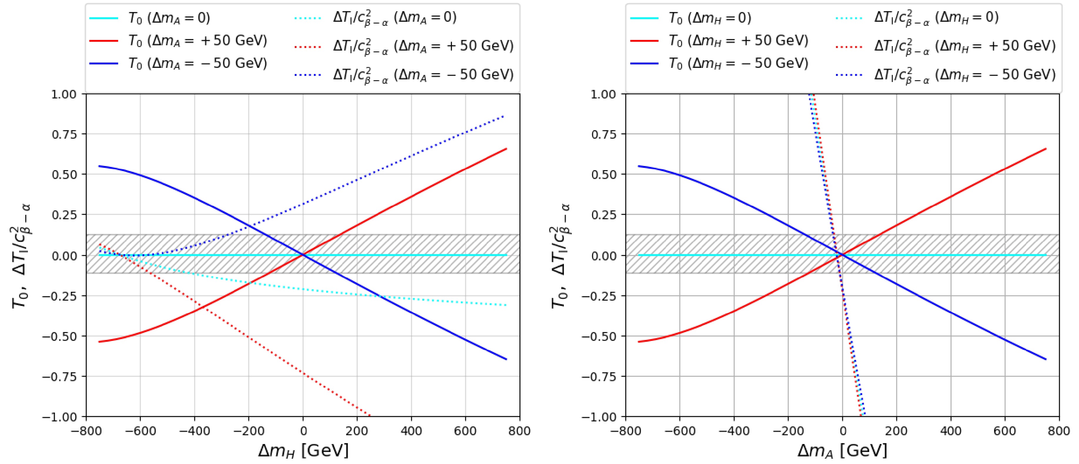 $ T_0 $ (solid lines) and$ \Delta T_{\rm{I}}/c^2_{\beta-\alpha} $ (dotted lines) with varying$ \Delta m_H $ (left) and$ \Delta m_A $ (right). The cyan, red, and blue lines indicate$ \Delta m_{A,H}= $ 0, + 50 GeV, and −50 GeV, respectively. The grey hatch area is the 1σ region of the T observable.$ m_{H^\pm} $ is chosen to be 800 GeV.However, the