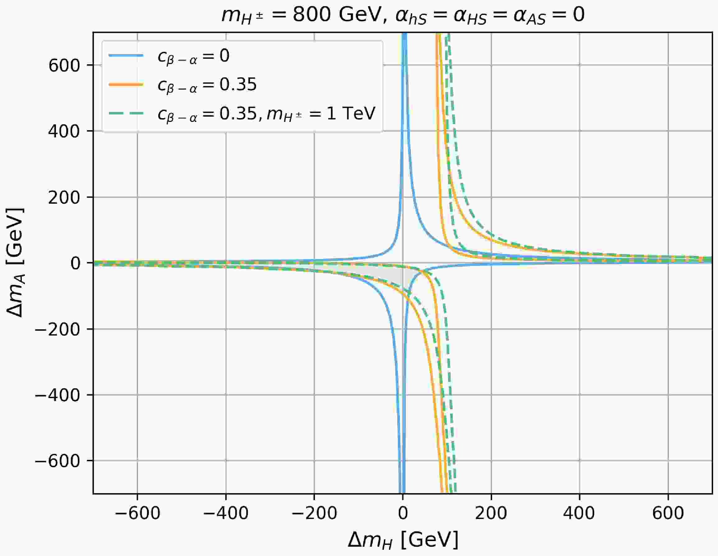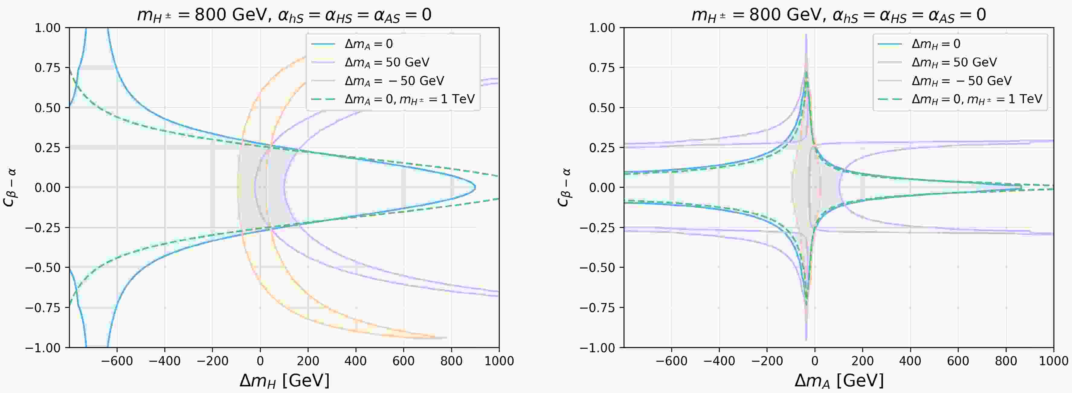 $ c_{\beta-\alpha} $ vs.$ \Delta m_H $ (left) and$ \Delta m_A $ vs.$ c_{\beta-\alpha} $ (right). The other parameters are chosen as$ \alpha_{HS}=\alpha_{hS}=\alpha_{AS}=0 $ and$ m_H^\pm = 800 $ GeV (solid curves). The blue, purple, and orange regions correspond to$ \Delta m_{A,H}=0,\ 50,\ -50 $ GeV, respectively. The green dashed curves represent$ m_{H^\pm} = 1000 $ GeV and$ \Delta m_{A,H=0} $ . -