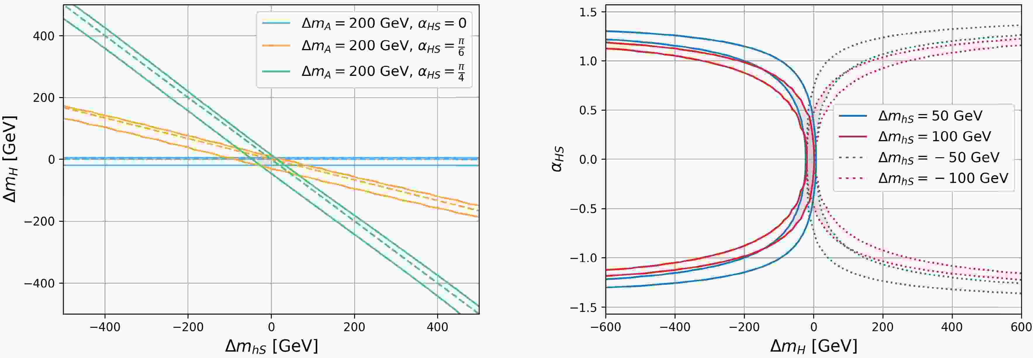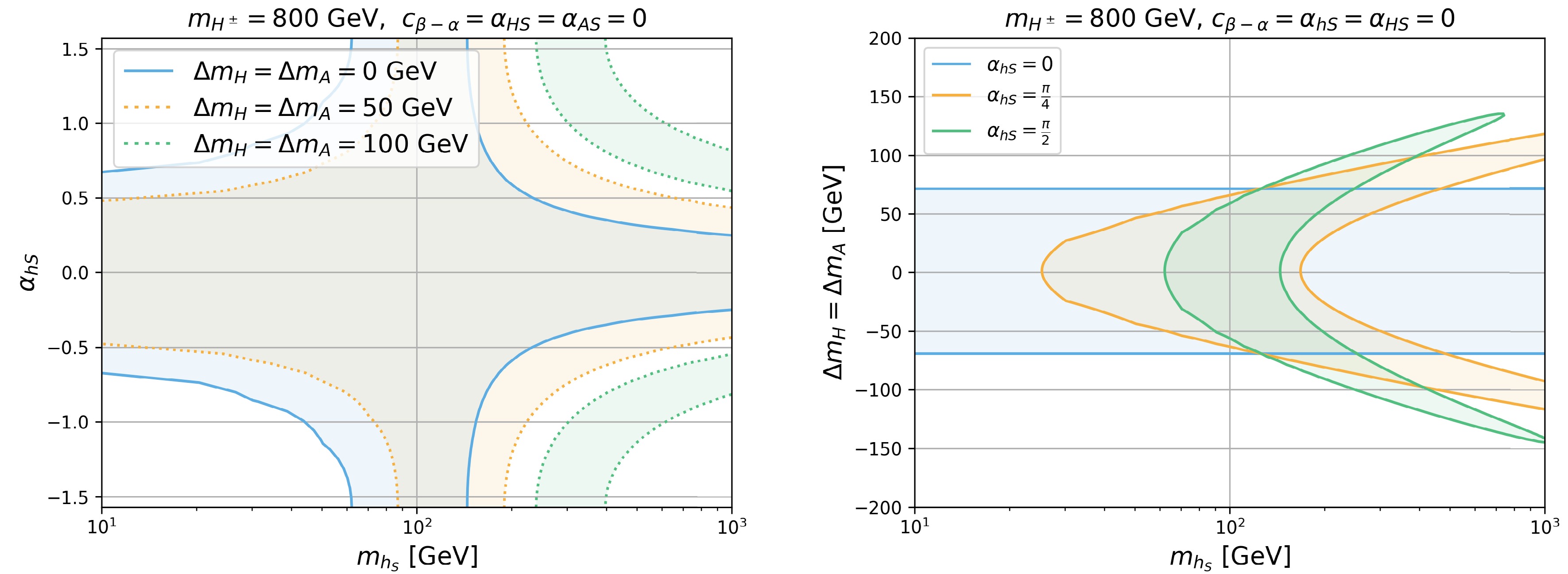 $ m_{h_S} $ ,$ \alpha_{hS} $ , and$ \Delta m_A $ . The left panel indicates$ m_{h_S} $ vs.$ \alpha_{hS} $ with varying$ \Delta m_A $ . The blue, orange, and green regions indicate$ \Delta m_A = \Delta m_H=0 $ , 50, 100 GeV, respectively. The right panel indicates$ m_{h_S} $ vs.$ \Delta m_{H,A} $ with varying$ \alpha_{hS} $ . The blue, orange, and green regions indicate$ \alpha_{hS}=0 $ ,$ {\pi}/{4} $ , and$ {\pi}/{2} $ , respectively. For both panels, we set$ m_{H^\pm}= 800 $ GeV and$ c_{\beta-\alpha}=\alpha_{HS}=\alpha_{AS}=0 $ .For
