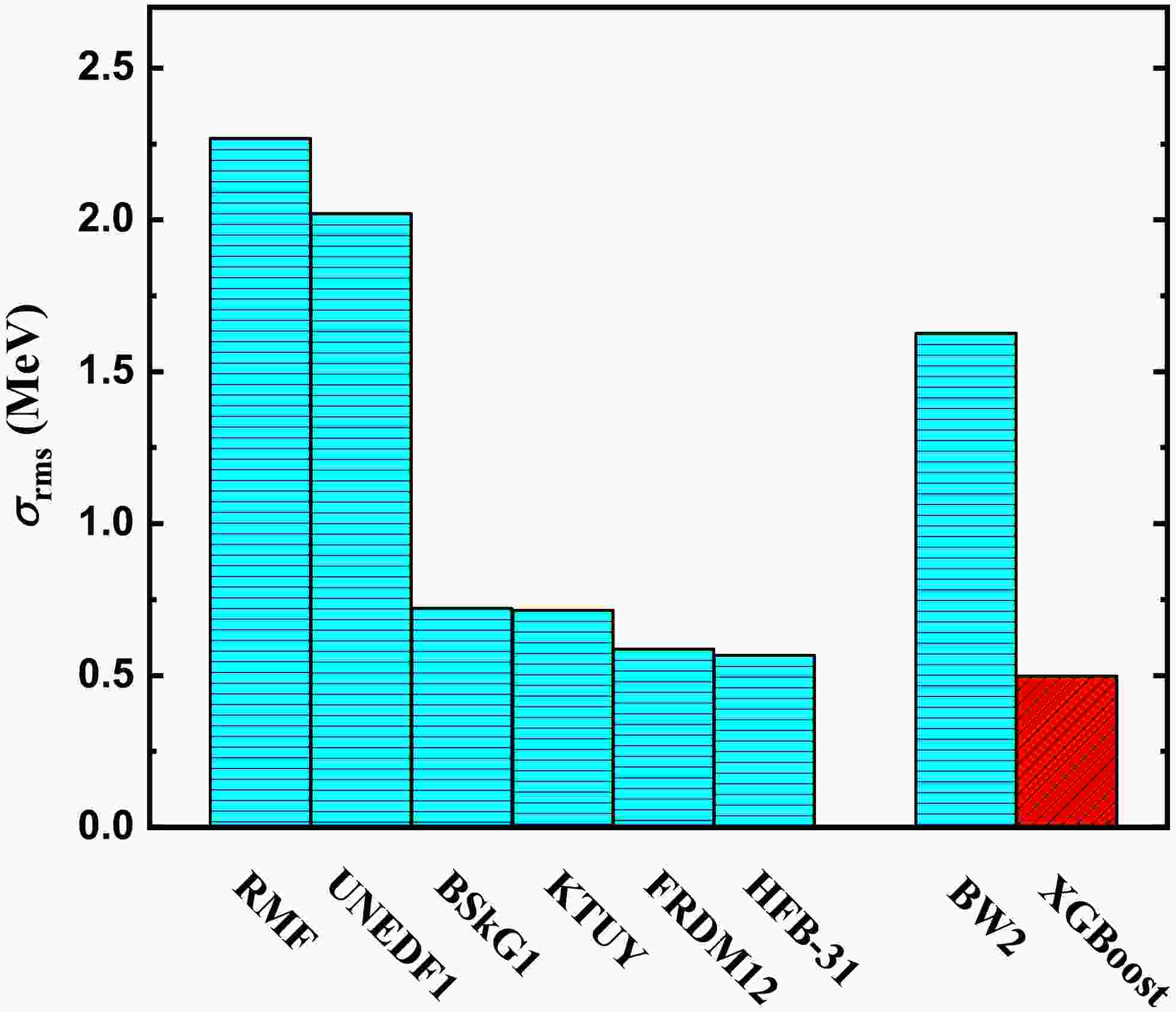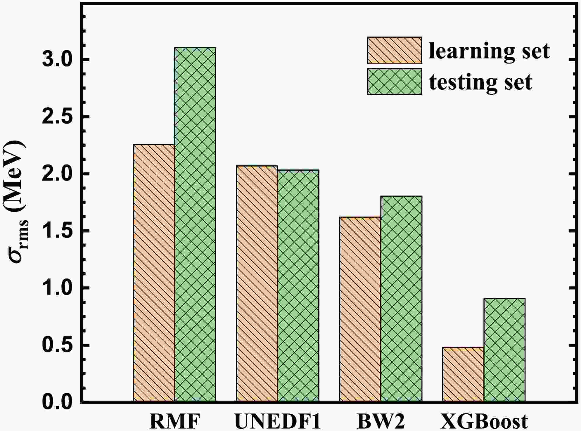 $ \sigma_{\rm{rms}} $ between the mass predicted by the theoretical models and experimental data [12]. Corresponding rms deviations from left to right given by the RMF, UNEDF1, BSkG1, KTUY, FRDM12, HFB-31, BW2, and XGBoost are shown.Figure 6 compares rms deviations between the learning and testing sets of RMF, UNEDF1, and BW2 mass models and the XGBoost method, where the extrapolation ability is studied with nuclei that first appear in AME2020 as the test set. The results confirm that the rms deviation of the learning set is reduced from