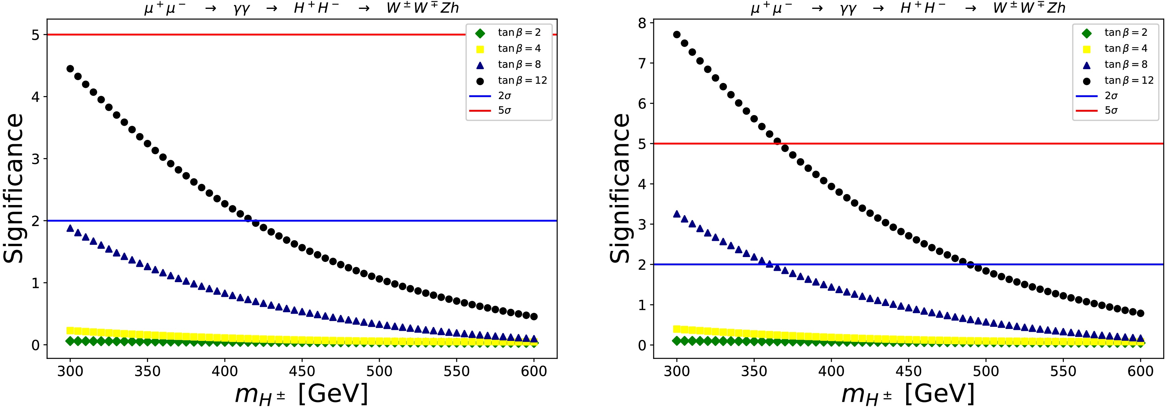 $ \mu^+\mu^- \to \gamma\gamma \rightarrow H^{+}H^{-} \rightarrow W^{\pm}W^{\mp}Zh $ at an integrated luminosity of$ {\cal{L}}=3000\; \text{fb}^{-1} $ are shown in the left panel. The corresponding signal significance taking into account the SM backgrounds is presented at$ {\cal{L}}=500\; \text{fb}^{-1} $ in the right panel.