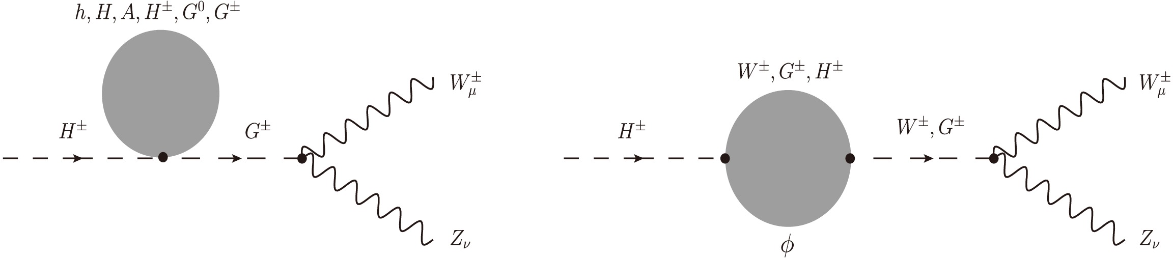 $ {\cal{T}}^{B, W^\pm}_{2, \text{Trig}}, {\cal{T}}^{B, Z}_{2, \text{Trig}}, {\cal{T}}^{B, W^\pm Z}_{2, \text{Trig}}, $ and$ {\cal{T}}^{B, A}_{2, \text{Trig}}, $ which involve vector and Goldstone boson propagators in terms of the gauge parameters$ \xi_{V} $ for$ V = W, Z $ . First, we present the representative form for$ {\cal{T}}^{B, W^\pm}_{2, \text{Trig}} $ with the cancellation checks of ξ-dependence as follows:$ \begin{aligned}[b] \dfrac{ {\cal{T}}^{B, W^\pm}_{2, \text{Trig}} } { g_{Z W^\pm W^\mp} } =\;& \sum \limits_{\phi = h, H} \dfrac{ g_{\phi W^\pm W^\mp} \cdot g_{\phi H^- W^+} }{ 2 c_{W}^2 m_{W}^4 } \Big\{ c_{W^\pm}^{0} + c_{W^\pm}^{1} A_{0}(\phi) + c_{W^\pm}^{2} A_{0}(W) + c_{W^\pm}^{3} B_{0}(W;\phi,W) + c_{W^\pm}^{4} B_{0}(H^\pm;\phi,W) \\&+ c_{W^\pm}^{5} B_{0}(Z;W,W) + c_{W^\pm}^{6} C_{0}(W,Z,H^\pm;\phi,W,W) + c_{W^\pm}^{7} A_{0}(\xi_{W}\; W) + c_{W^\pm}^{8} B_{0}(W;\phi,\xi_{W}\; W) + c_{W^\pm}^{9} B_{0}(H^\pm;\phi,\xi_{W} W)\\& + c_{W^\pm}^{10} B_{0}(Z;W,\xi_{W} W) + c_{W^\pm}^{11} B_{0}(Z;\xi_{W}\; W,\xi_{W}\; W) + c_{W^\pm}^{12} C_{0}(W,Z,H^\pm;\phi,W,\xi_{W} W) \\&+ c_{W^\pm}^{13} C_{0}(H^\pm,Z,W; \phi,W,\xi_{W} W) + c_{W^\pm}^{14} C_{0}(W,Z,H^\pm; \phi,\xi_{W} W,\xi_{W} W) \Big\}. \end{aligned} $