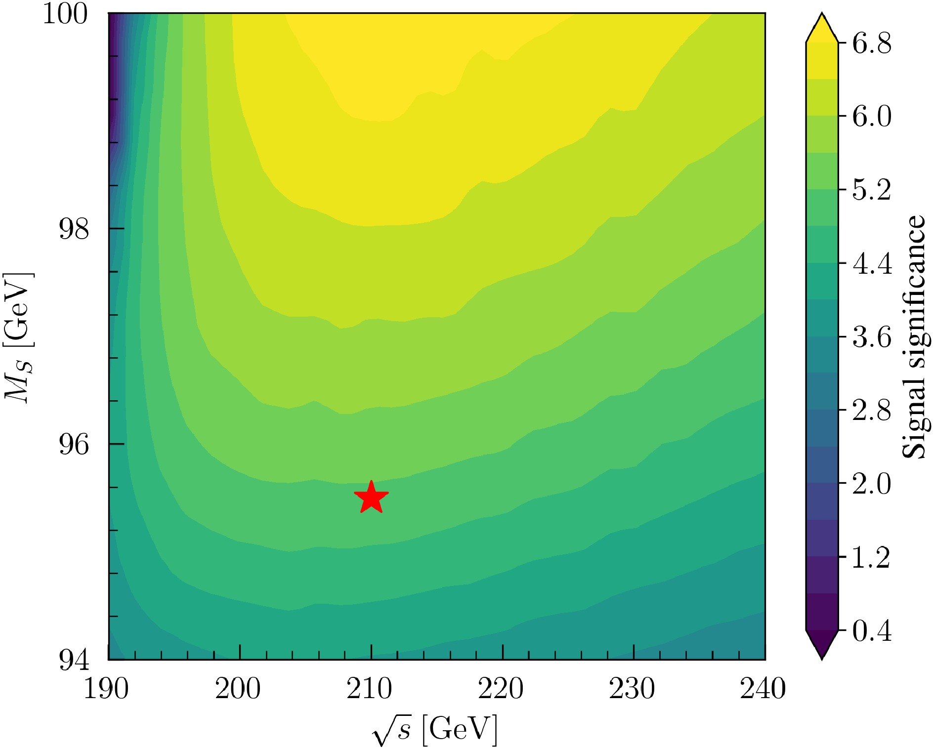 $ \mathcal{Z} $ in the$ M_S $ versus$ \sqrt{s} $ plane, assuming an integrated luminosity of 500$ {\rm{fb}}^{-1} $ . The red star indicates the benchmark point at$ M_S = 95.5 $ GeV and$ \sqrt{s} = 210 $ GeV.$ \mathcal{Z}= \sqrt{2L\left[(\mathcal{S}+\mathcal{B})\ln(1+\mathcal{S}/\mathcal{B})-\mathcal{S}\right]}, $