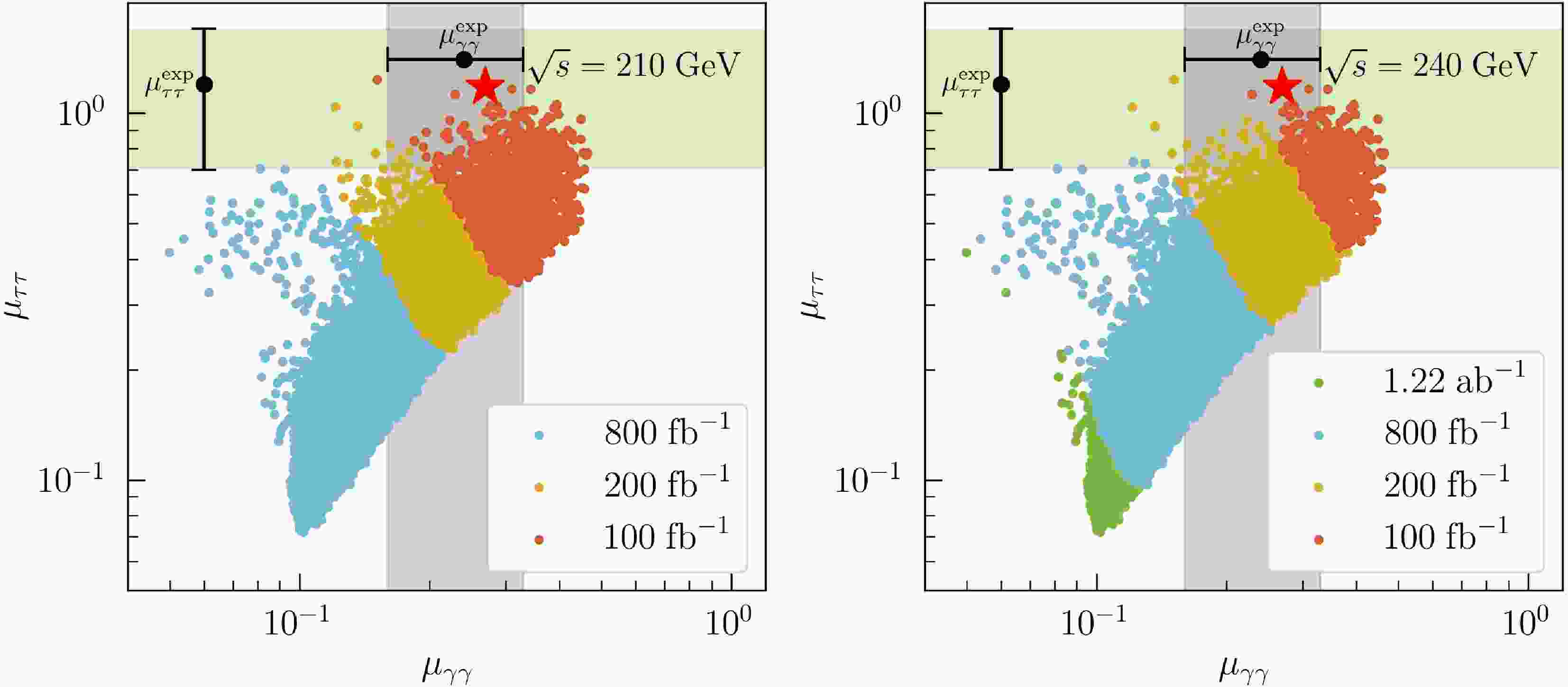 $ \mu_{\tau\tau} $ versus$ \mu_{\gamma\gamma} $ plane at$ \sqrt{s}=210 $ GeV (left panel) and$ \sqrt{s}=240 $ GeV (right panel). CEPC with$ L=100,\; 200,\; 800 {\; {\rm{fb}}}^{-1},\; \mathrm{and}\; 1.22 {\; {\rm{ab}}}^{-1} $ can cover the red, yellow, blue, and green samples at the$ 5\sigma $ level, respectively. All the surviving samples can be covered at$ 5\sigma $ for$ \sqrt{s} = 210 $ GeV with$ L=800 {\; {\rm{fb}}}^{-1} $ and$ \sqrt{s} = 240 $ GeV with$ L=1.22 {\; {\rm{ab}}}^{-1} $ . The red star marks the best-fit point. The green and purple shaded bands indicate the experimental$ 1\sigma $ ranges for the$ \tau^+\tau^- $ and$ \gamma\gamma $ channels, respectively. -