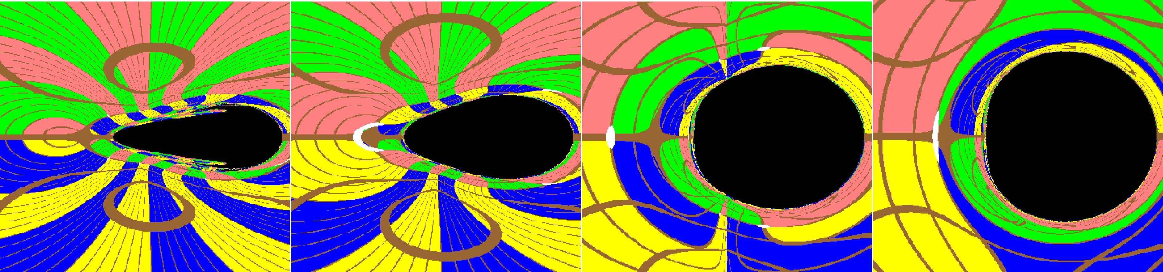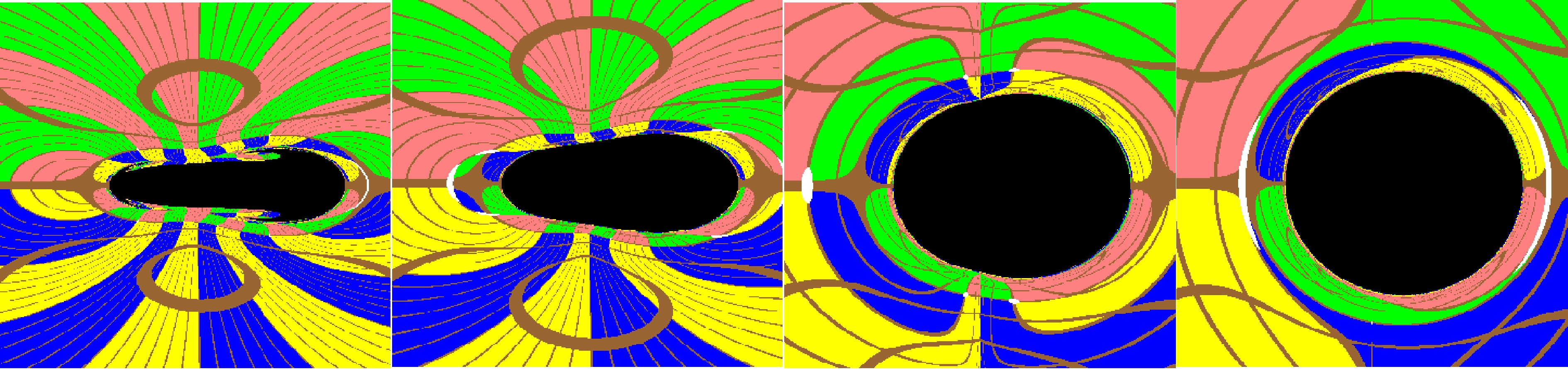 Figure 4.  (color online) The variation of images with the Brans-Dicke parameter ω for the Brans-Dicke-Kerr spacetime with fixed $ a=1.05 $. Here we set the mass parameter $ M=1 $, $ r_{obs}=8M $ and $ \theta_{obs}=\pi/2 $. The figures from left to right correspond to $ \omega=0.4 $, 1, 10, and 500, respectively.
